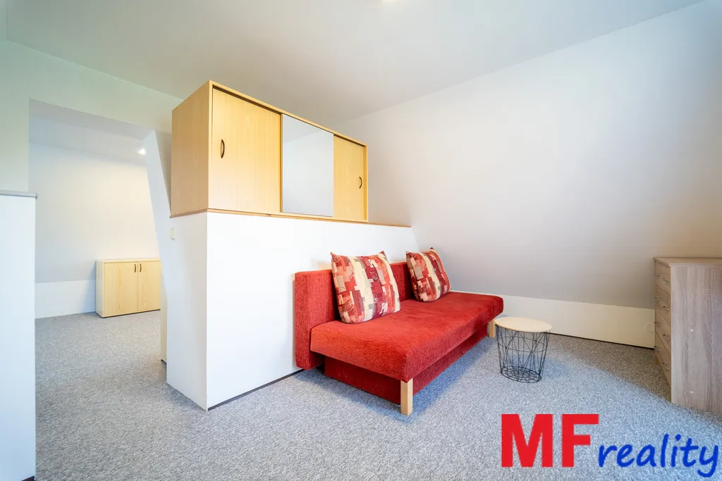 Vstup do podkroví je přes kovové točité schodiště s otevřeným obytným prostorem tvořící dvě průchozí místnosti se vstupem na druhý balkon. Podlahy jsou dřevěné kryté kobercem. Přitápět lze olejovým radiátorem.