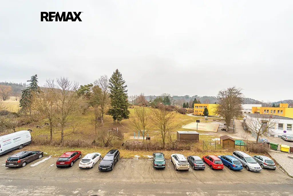 Výhled z balkonu je na jižní stranu do zeleně na dětské hřiště.
