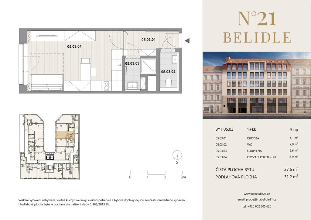 K prodeji nabízíme byt č. 5.03 o dispozici 1+kk s východní orientací, situovaný v 5. nadzemním podlaží nově vznikajícího rezidenčního projektu Na Bělidle 21.