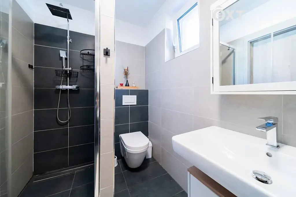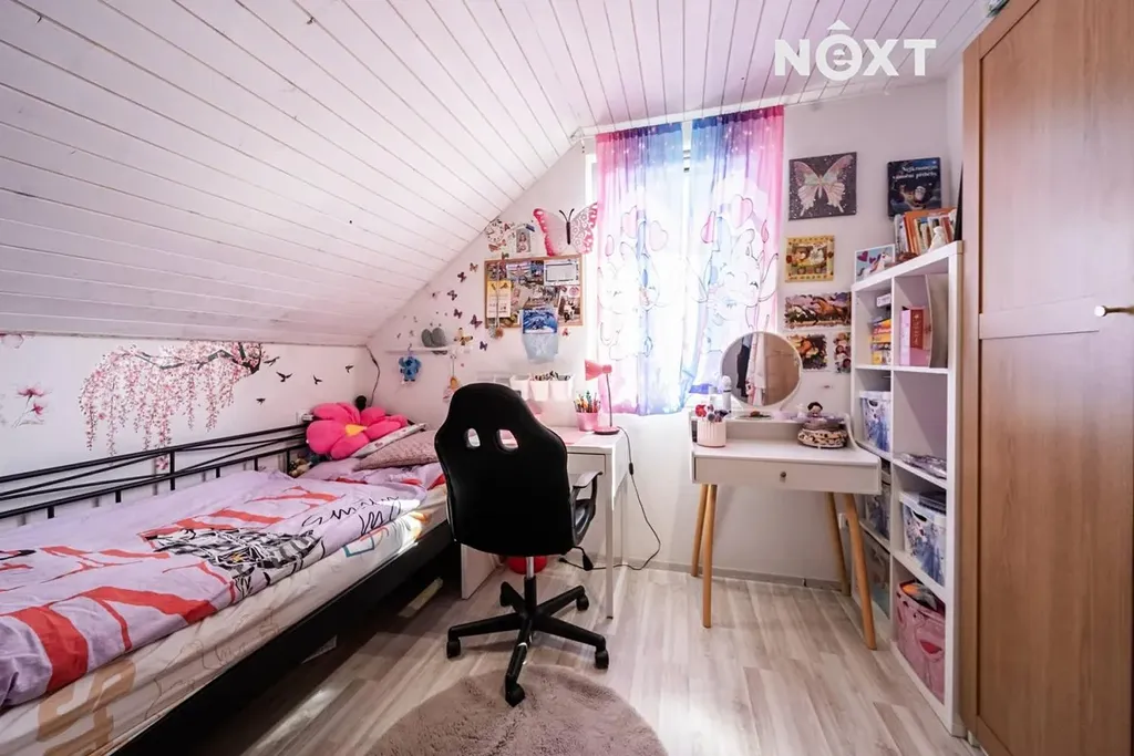 Užitná plocha 87 m² a dispozice 5+kk se na první dobrou může zdát jako zbytečně moc pokojů, ale pokud máte děti, tak ty tři samostatné pokojíky nahoře jistě oceníte. No a pokud je nemáte, můžete buď jednu příčku jednoduše odstranit a pokoj si zvětšit, případně můžete dojít k rozhodnutí, že chcete podpořit statistiky porodnosti a pořídíte si dítě třetí. Kromě zmíněných pokojů nahoře najdete prostornou koupelnu s vanou.