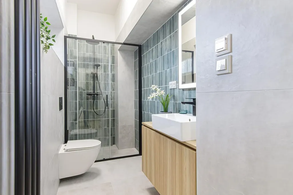 - Designová koupelna s walk-in sprchovým koutem