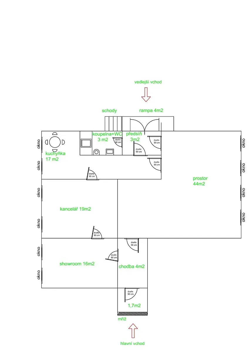 Větší část (118m2) je tvořena provozní plochou vhodnou ke zřízení kanceláře, sídla firmy, eshopu, specializované prodejny, atp… Součástí je také sociální zařízení a kuchyňka.