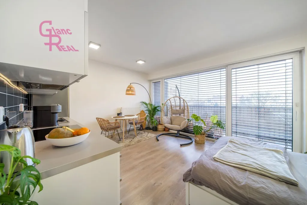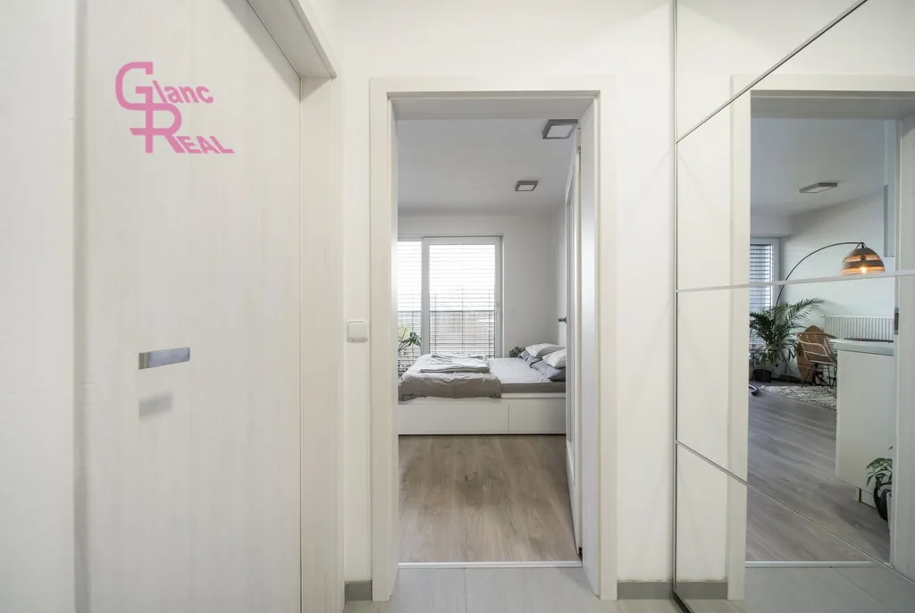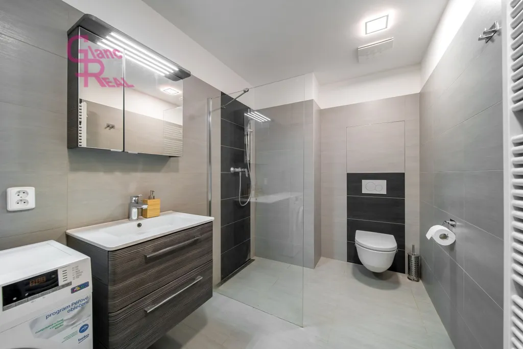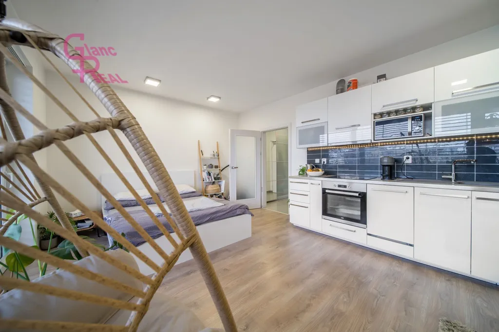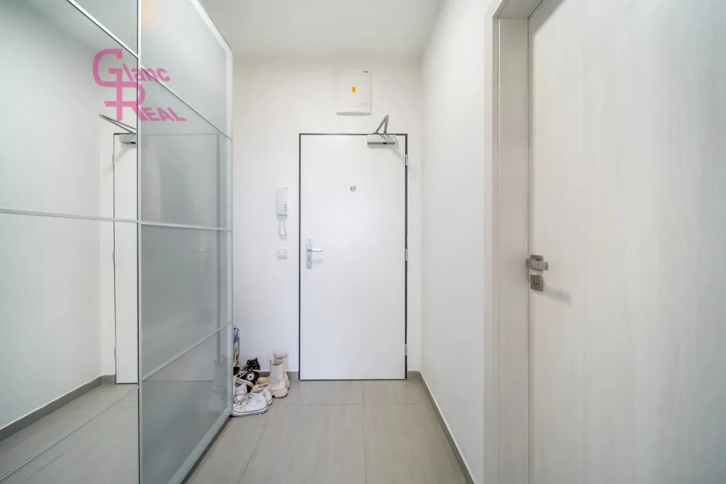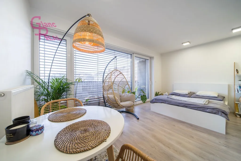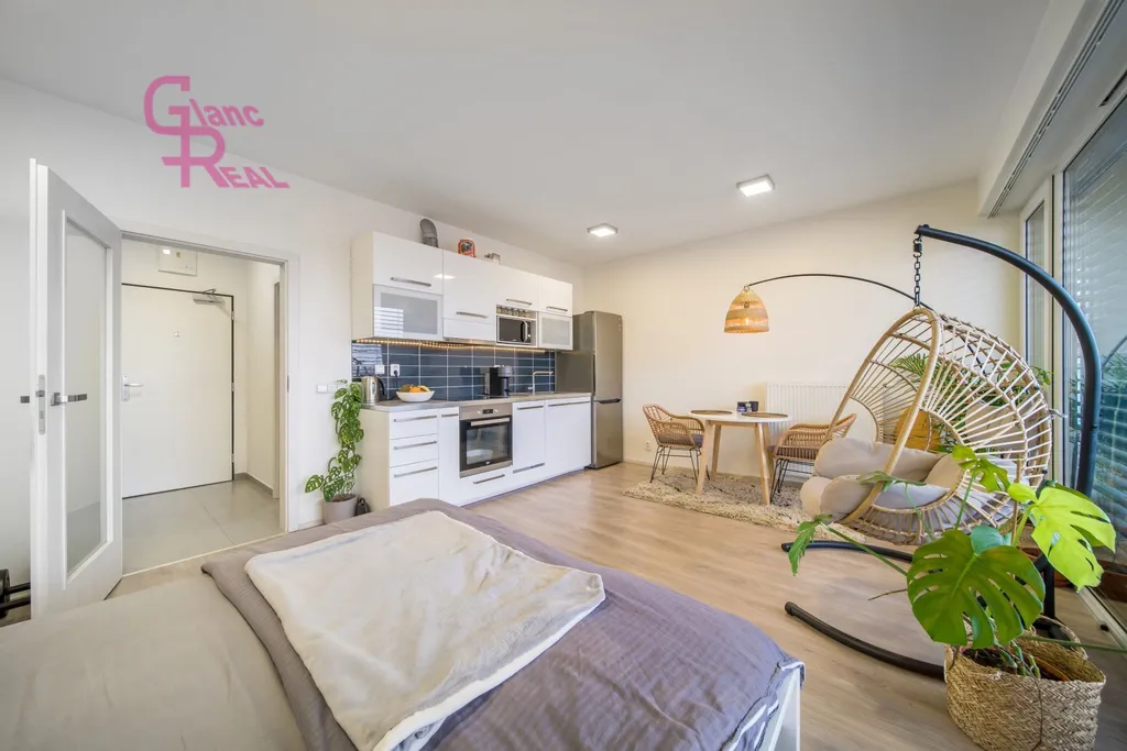 vstupními dveřmi vejdeme do předsíně o výměře 4 m2, kde se nachází prostorná šatní skříň s velkým úložným prostorem, z předsíně je vstup do prostorné koupelny se sprchovým koutem, umyvadlem se skříňkou, pračkou a závěsným WC o výměře 6 m2, pokoj s kuchyňským koutem o výměře 21 m2 se dvěma vstupy na prostornou terasu 8 m2. Bytová jednotka se nabízí částečně zařízená, kuchyňská linka vč. spotřebičů (sklokeramická varná deska, myčka, digestoř, el. trouba, mikrovlnná trouba, lednice).