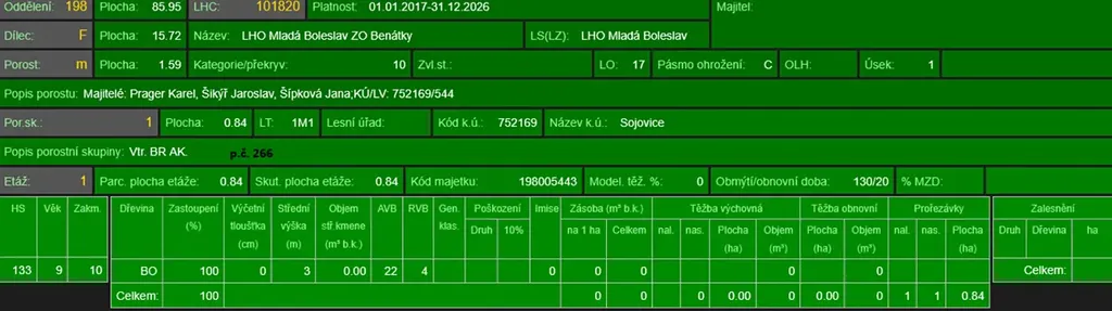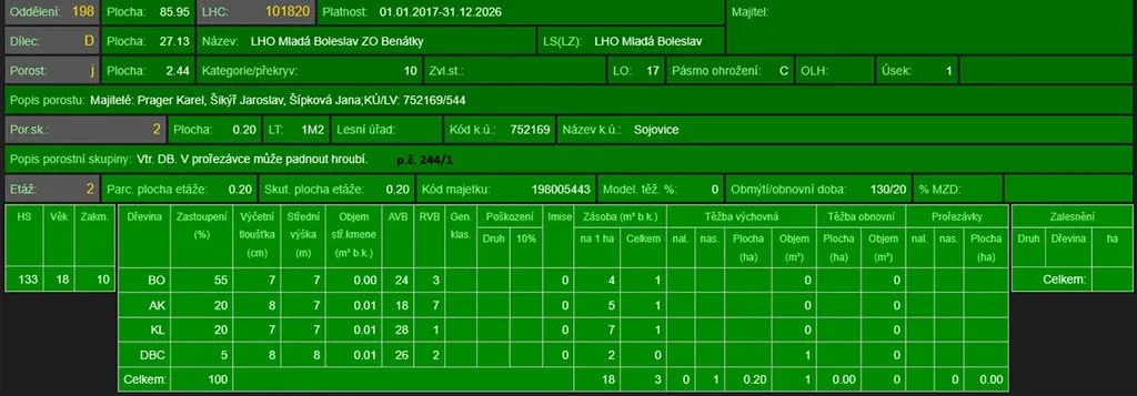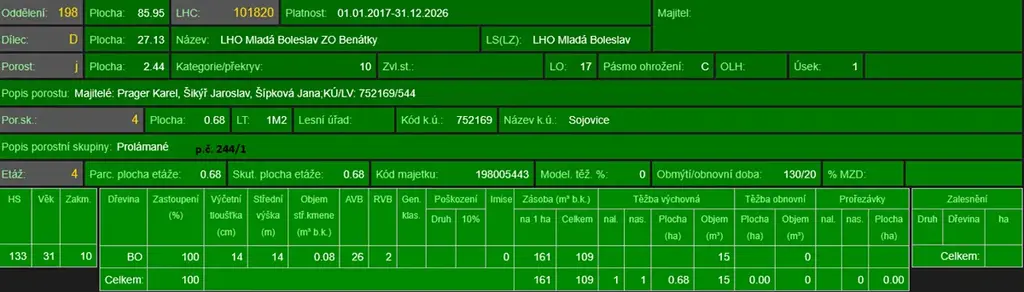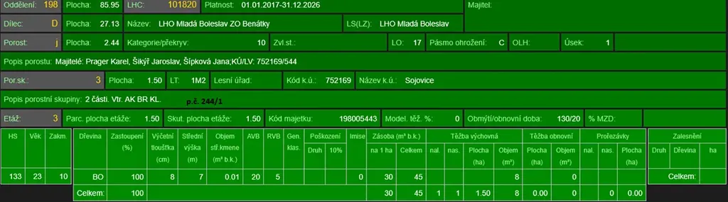 - p.č. 244/1 vedená jako lesní pozemek o celkové výměře 24 204 m2, z toho vlastníme podíl 1/6 tedy 4 034 m2 (stáří lesa 40 let - zastoupení dřevin borovice, stáří lesa 32 let - zastoupení dřevin borovice, stáří lesa 27 let - zastoupení dřevin borovice, akát, javor, dub),