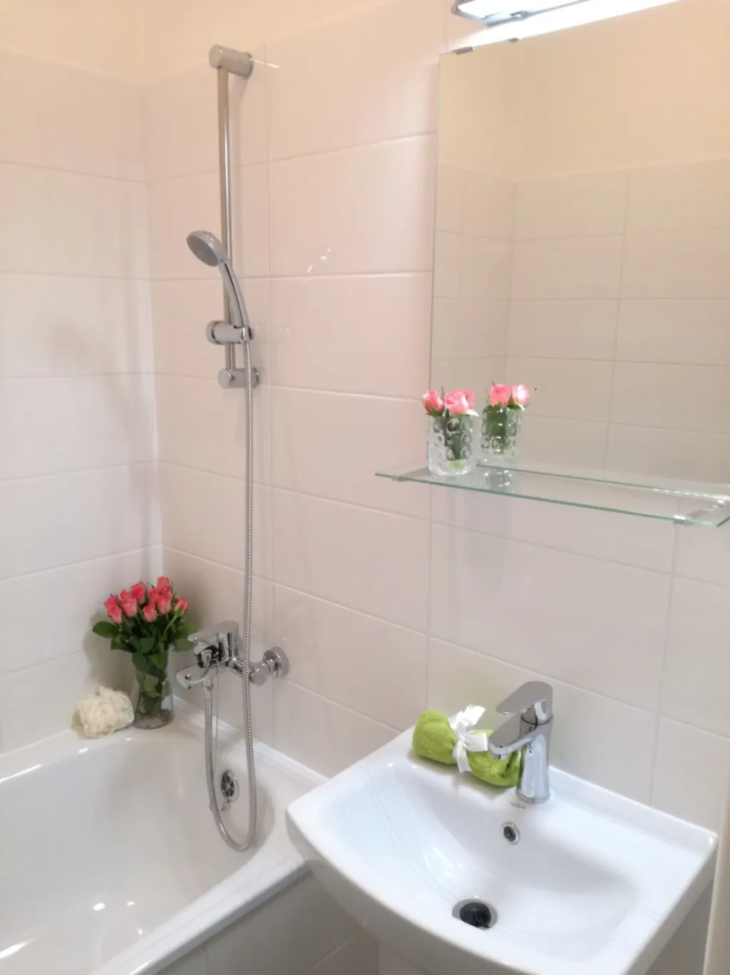 Koupelna disponuje vanou a umyvadlem, toaleta je odděleně.