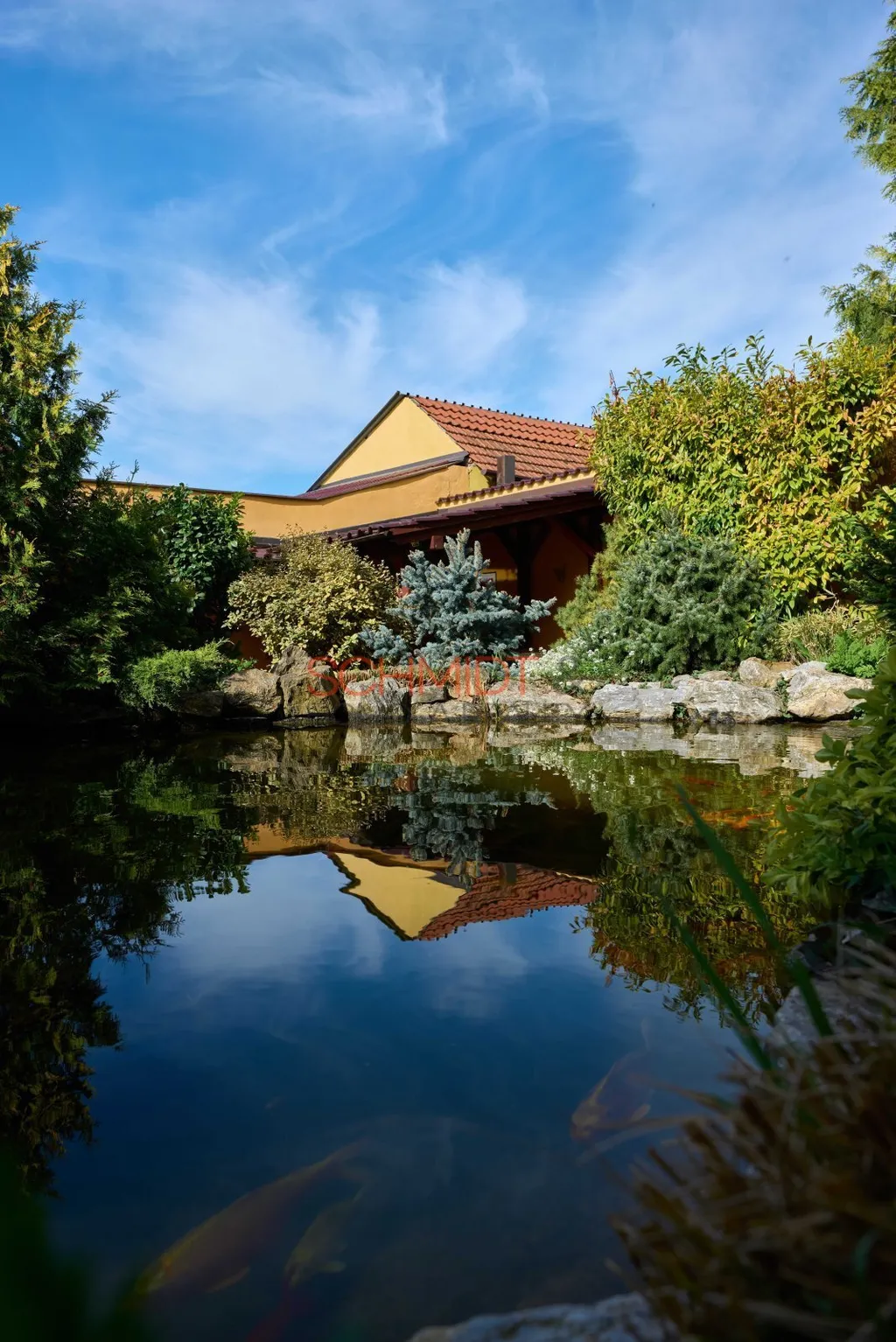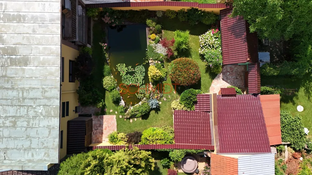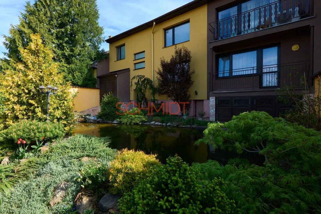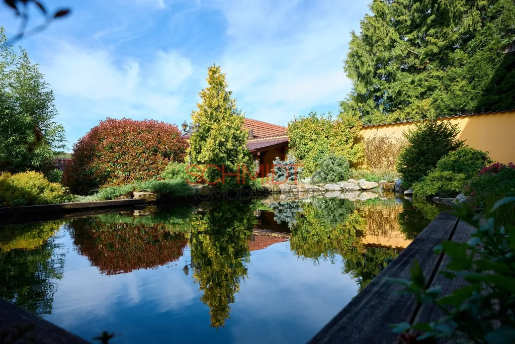 Zásadní proměnou prošla také zahrada. Okrasné části vedle domu dominuje rybník (50.000 litrů vody) s filtrací a kapry Koi, jehož okolí zdobí vzrostlé okrasné keře a rostliny. K posezení v tomto krásném prostředí slouží zastřešený altán. Červeným kvarcitem je provedeno vydláždění pochozích částí okrasné zahrady. Drobná hospodářská stavení slouží k uskladnění zahradního vybavení, případně chovu drobného zvířectva a dřevník k uchování dřeva do krbu. Celá část zahrady je kompletně osvětlená, je zde i rozvod elektřiny.
