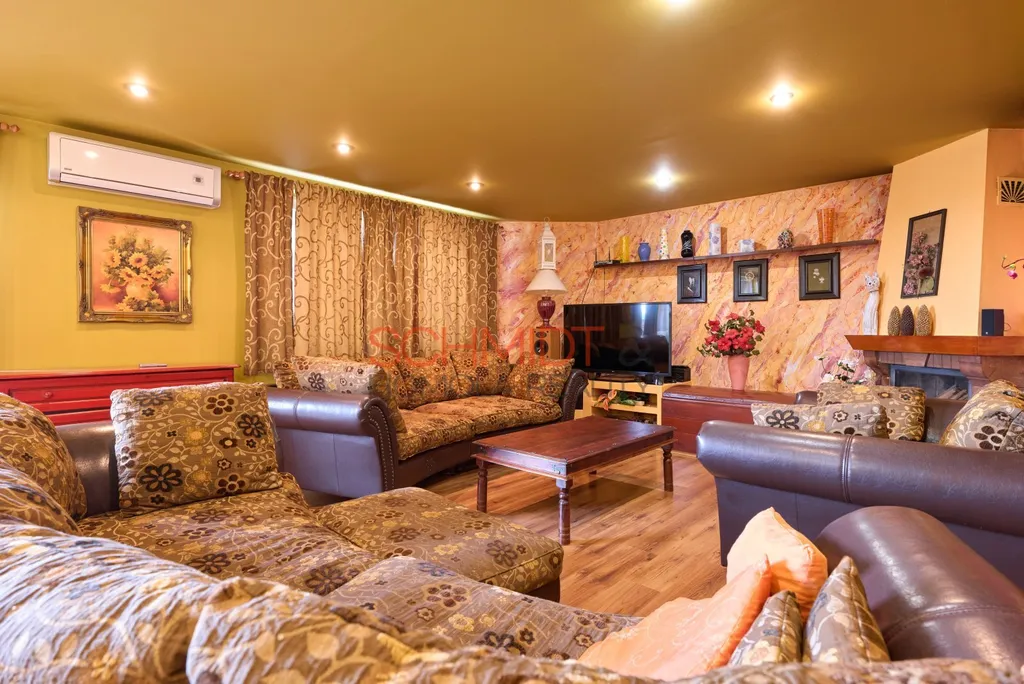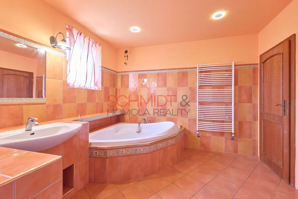 - 2NP má dispozici 4kk. Nabízí tři neprůchozí ložnice a velký obývací pokoj s kuchyňským koutem. V obývacím pokoji je krb s rozvodem tepla do všech místností v patře. I zde je z obývacího pokoje přístup na balkon s výhledem do okrasné zahrady a širšího okolí. V prvním podlaží je dále klimatizace, v koupelně podlahové vytápění.