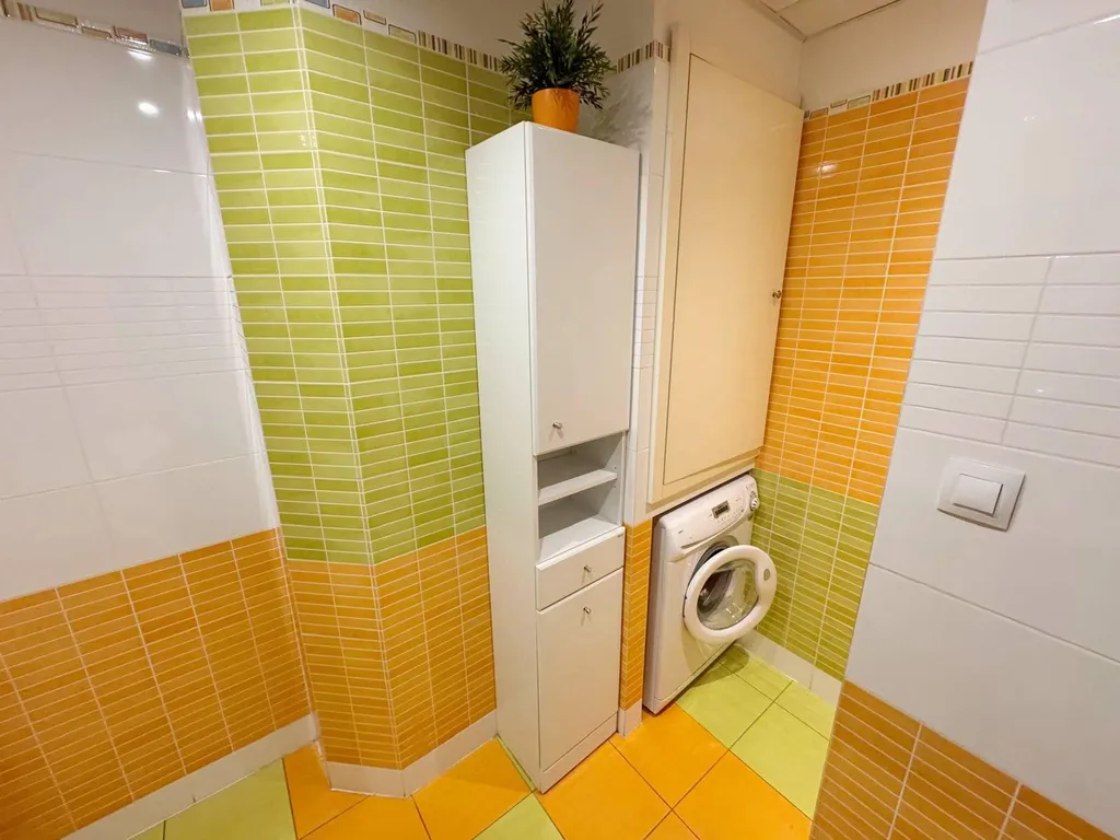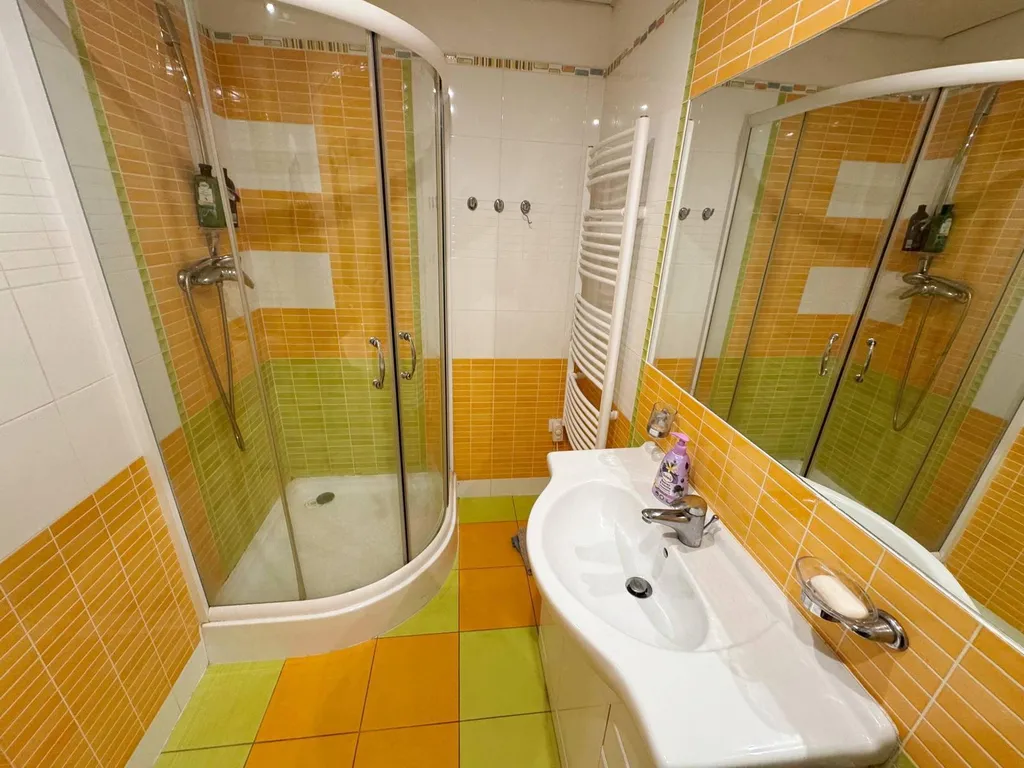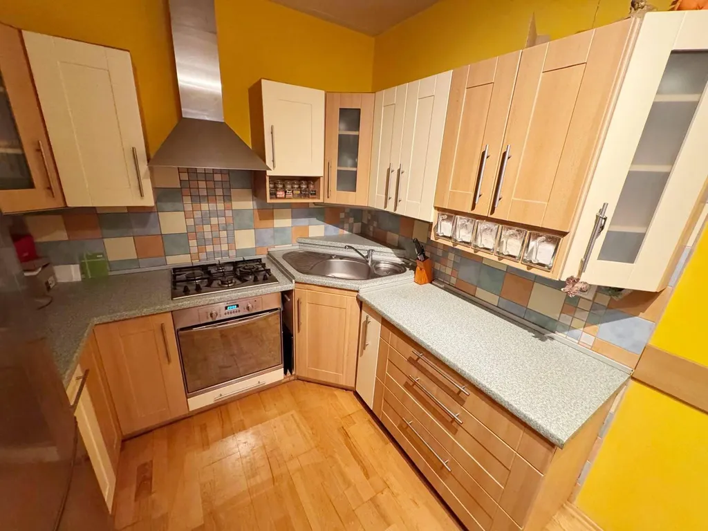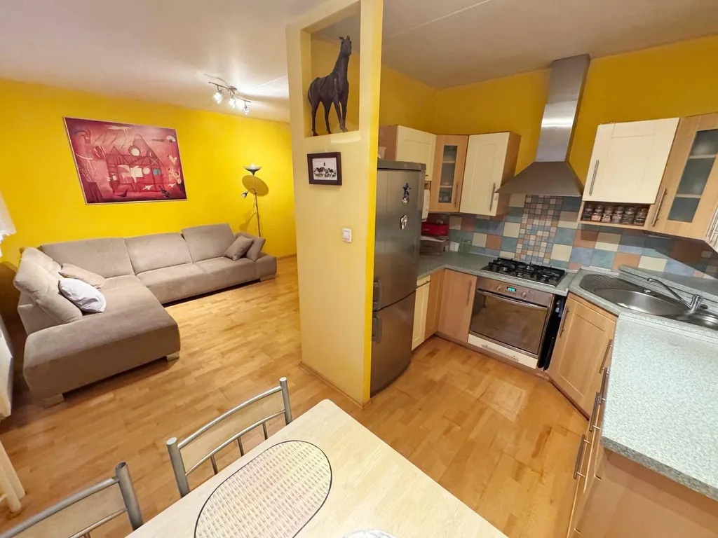 V kuchyni je rohová kuchyňská linka s vestavnými kamny a plynovým sporákem s digestoří. Koupelna obložena barevnými obklady, vybavena sprchovým koutem a umyvadlovou skříňkou, přípojka na pračku připravena. WC odděleno. K bytu náleží komora.