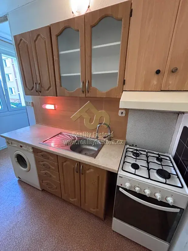 Má 2 samostatné neprůchozí pokoje, ve vstupní předsíni je zbudovaná šatní a botní komora o výměře 2,15 m2. Dále má byt kuchyni do tvaru „L“ s kuch.linkou vč. plyn.sporáku s troubou, digestoří a pračkou. Koupelna a toaleta je oddělena dveřmi, lze je užívat jako průchozí nebo se samostatnými vstupy – do koupelny z kuchyně, na WC z chodby. Byt má plastová okna vč. žaluzií, rozvody vody a stupačky v plastu a je nabízen bez vybavení. Je v původním, ale udržovaném stavu.