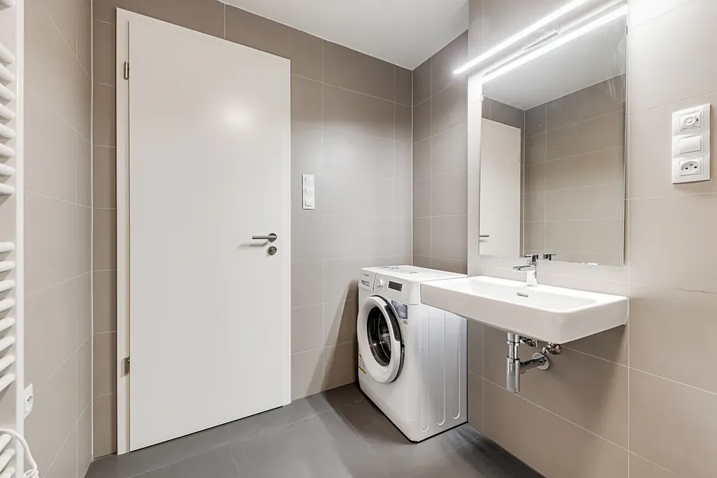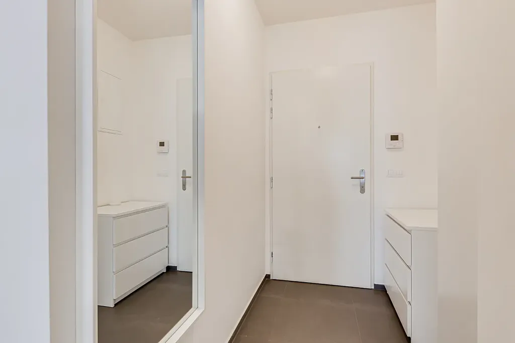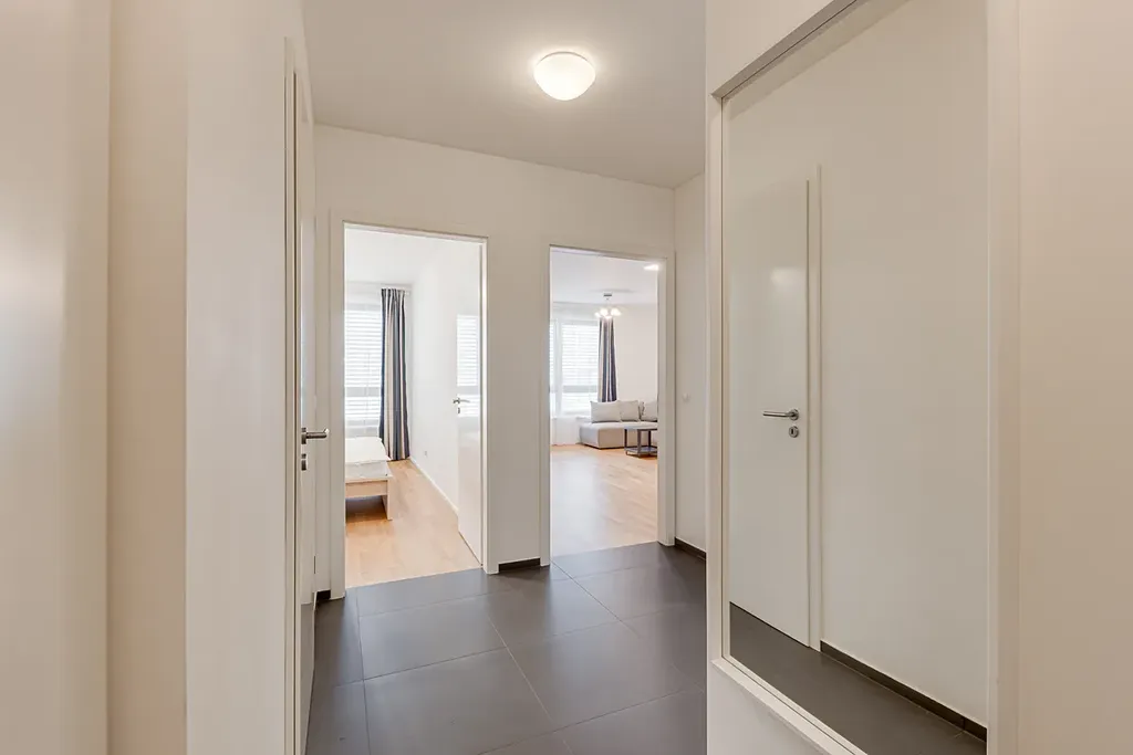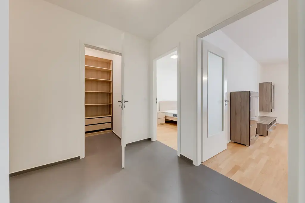 Byt je celkově vybaven, má kuchyňskou linku včetně spotřebičů (varná deska, pečicí trouba, digestoř, chladnička a mikrovlnná trouba), jídelní stůl a čtyři židli. V obývacím pokoji je velká pohovka, obývací stěna. Ložnice má velkou manželskou postel, noční stolky. V koupelně je vana, WC, pračka umyvadlo s zrcadlem. V předsíni je velká skříň a botník.