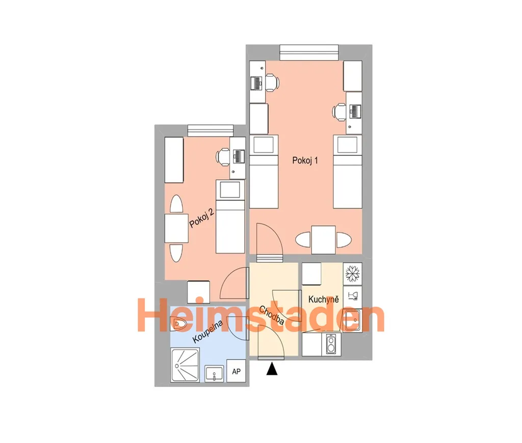 Dispozici tvoří dva samostatné, neprůchozí pokoje. Větší pokoj je vybaven dvěma jednolůžkovými postelemi, menší pokoj jednou jednolůžkovou postelí, což umožňuje komfortní bydlení až pro tři osoby. Samostatná kuchyně je plně zařízená a připravená k okamžitému užívání. Byt se pronajímá kompletně vybavený, takže nabízí možnost rychlého nastěhování bez nutnosti dalších investic.