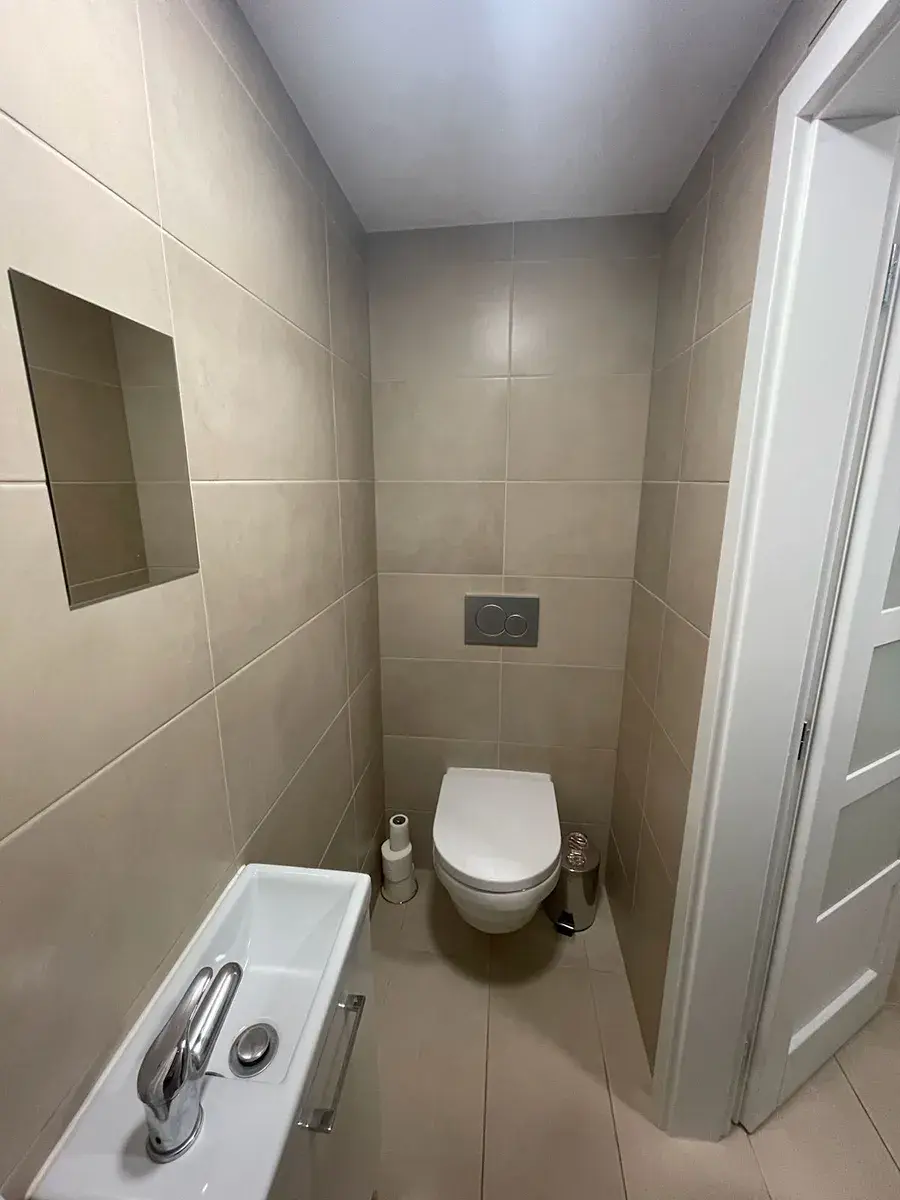 Dispozice zahrnuje vstupní chodbu, hlavní místnost s kuchyňským koutem a koupelnu. Jedná se o suterénní prostor, který disponuje menším oknem orientovaným do prostoru pozemku domu.