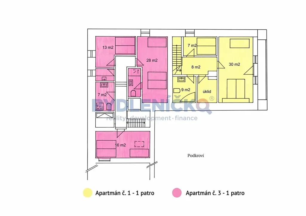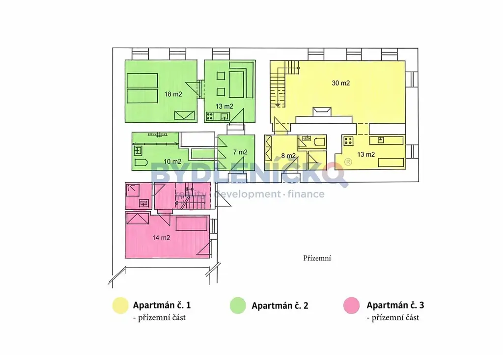 Nemovitost je rozdělena na 3 samostatné apartmány se samostatnými vstupy: