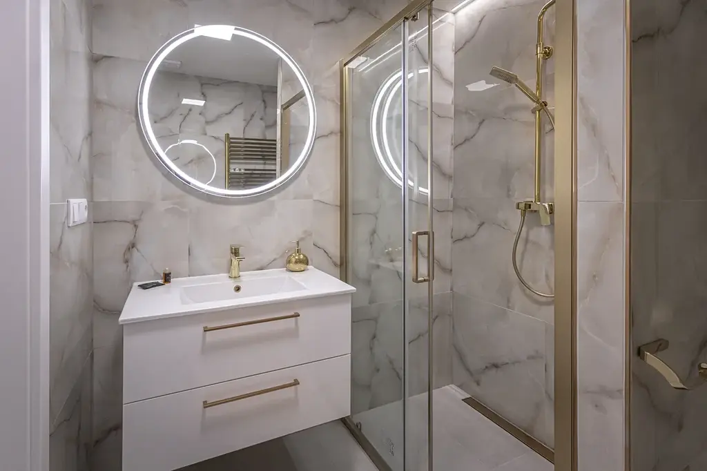 ✔️ prostorná koupelna se zlatými prvky, vanou i sprchovým koutem