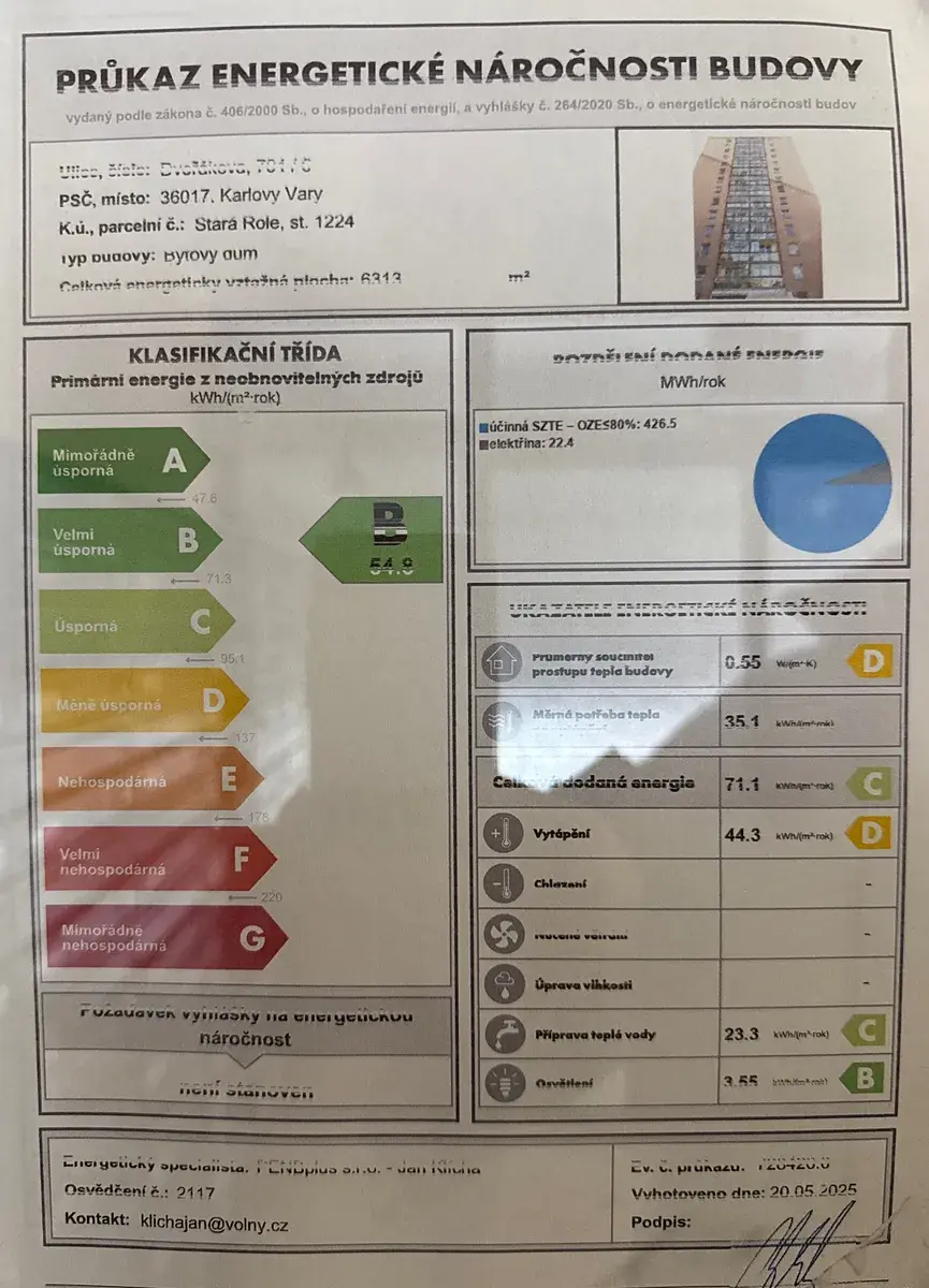 Nabízím k prodeji byt 3+kk v osobním vlastnictví o výměře 57 m2, který se nachází v devátém nadzemním podlaží třináctipodlažního domu se dvěma výtahy. Byt má plastová okna, jinak je v původním stavu. V kuchyni a pokoji jsou dva vstupy na balkon o výměře 6,3 m2. Okna i balkon jsou orientované západním směrem. Poplatky spojené s užíváním bytu (zálohy na teplo, TUV, vodu apod.) jsou ve výši 3.500,- Kč při jedné osobě. Dům má zateplenou fasádu a žijí zde slušní lidé. Třída energetické náročnosti - PENB třídu „B“. Pro více informací mě kontaktujte.