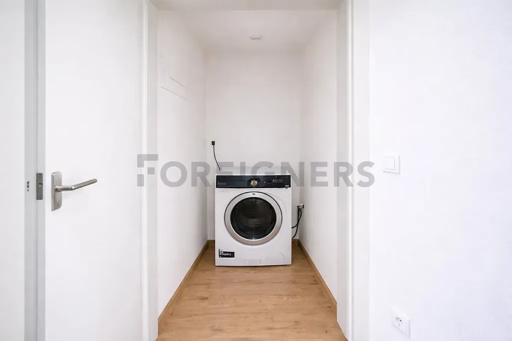 Prostorná chodba s nábytkem na míru, včetně praktické technické místnosti, kde se nachází pračka značky Electrolux.