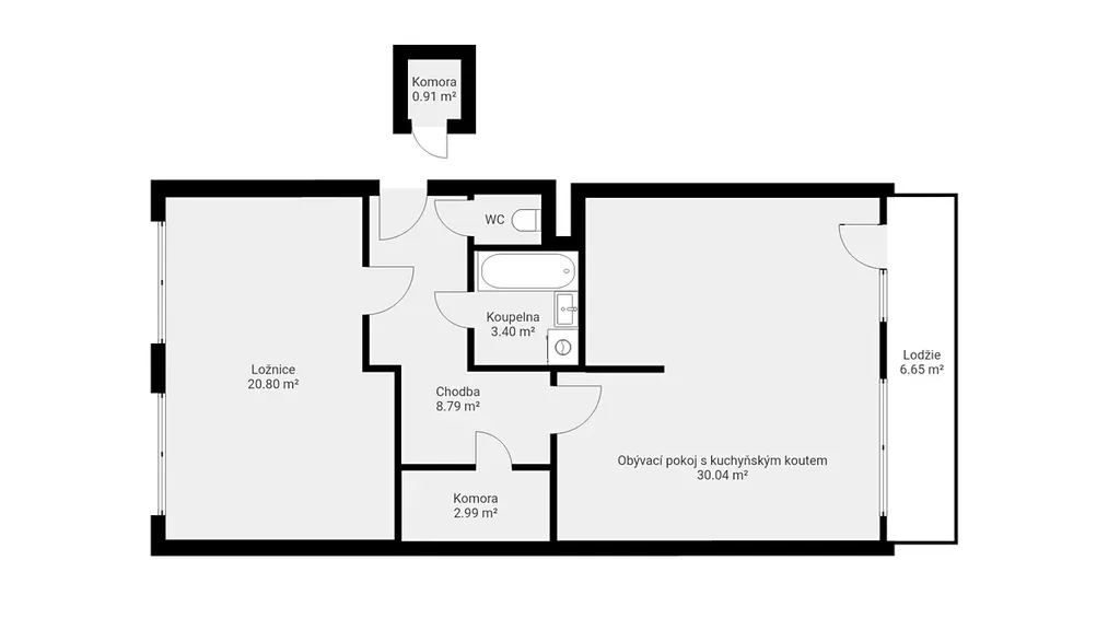 Obývací pokoj s kuchyňským koutem (27,4 m²) se vstupem na zasklenou lodžii (6 m²), ložnice s jižní orientací (21 m²; tento pokoj lze rozdělit na 2 pokoje s vlastním vstupem), samostatná šatna, koupelna s vanou a oddělené WC.