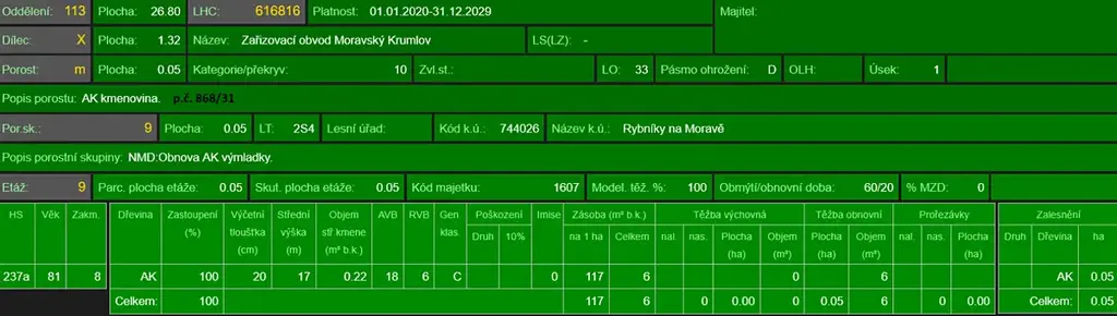 - p.č. 868/31 vedená jako lesní pozemek o celkové výměře 463 m2 (stáří lesa 87 let - zastoupení dřevin akát),