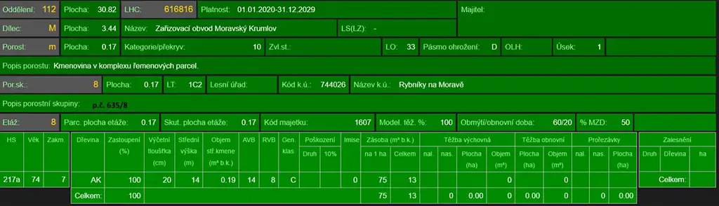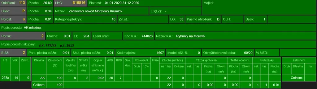- p.č. 635/8 vedená jako lesní pozemek o celkové výměře 1 742 m2 (stáří 80 lesa let - zastoupení dřevin akát),