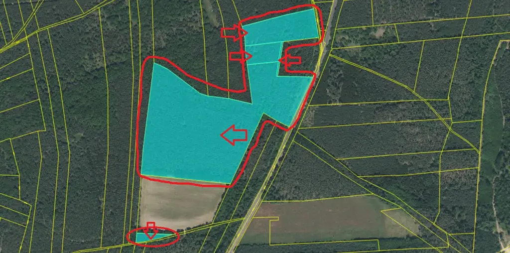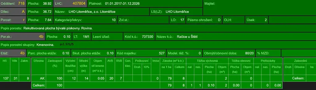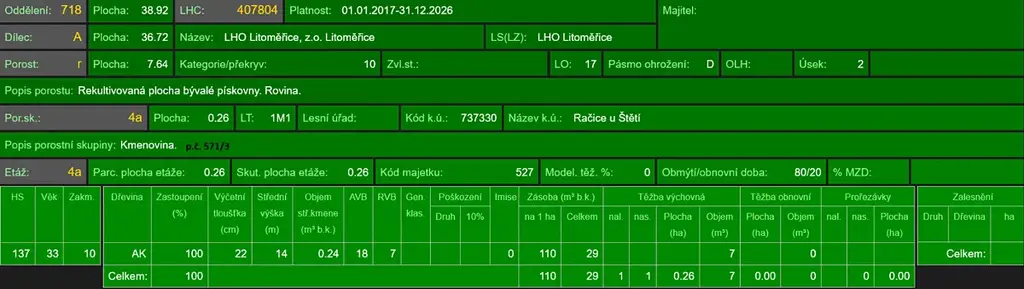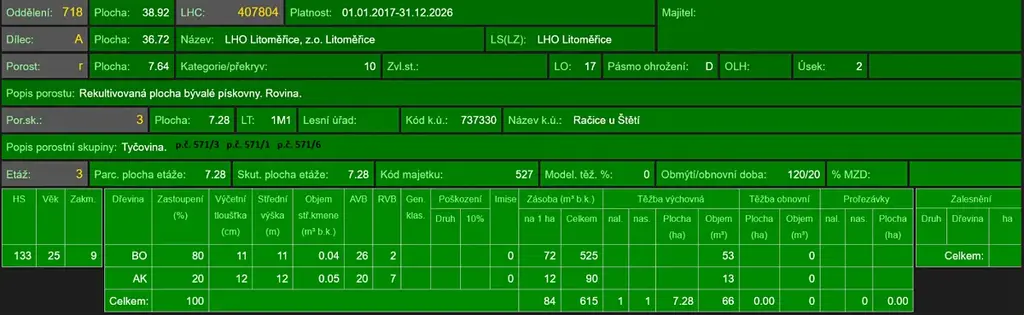 - p.č. 571/3 vedená jako lesní pozemek o celkové výměře 62 675 m2, z toho vlastníme podíl 1/2 tedy 31 337 m2 (stáří lesa 42 let - zastoupení dřevin akát, stáří lesa 34 let - zastoupení dřevin borovice, akát),