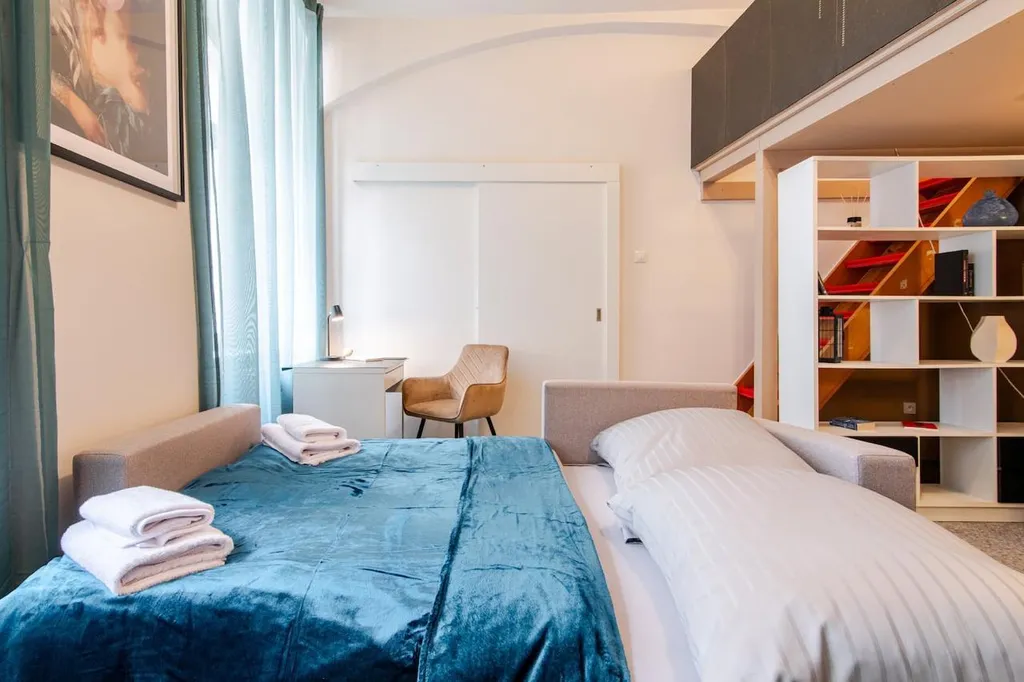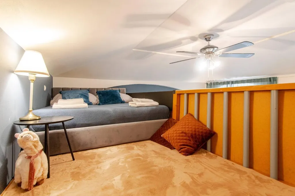 Dispozice je řešena velmi prakticky a zároveň netradičně vstupní část plynule navazuje na hlavní obytný prostor, který je doplněn o patro (spaní / další zóna). Díky tomu je byt vhodný až pro 4 osoby a nabízí efektivní využití prostoru.