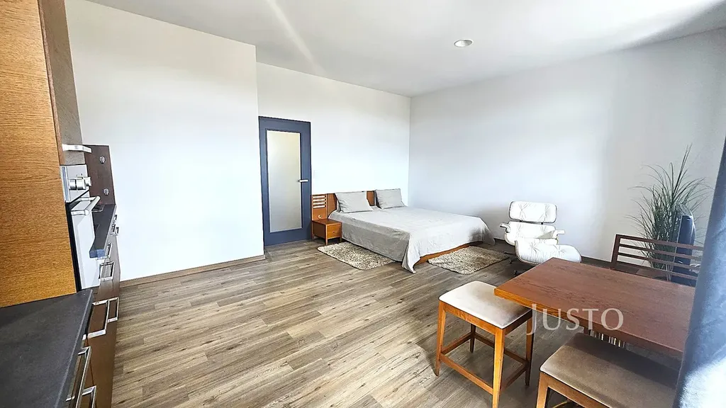 Vybavení bytu, postel, šatní skříň, konferenční stolek, televize, stůl, židle. Díky vybavení a dispozici je ideální pro jednotlivce, kteří hledají komfortní a moderní bydlení bez nutnosti dalších investic.