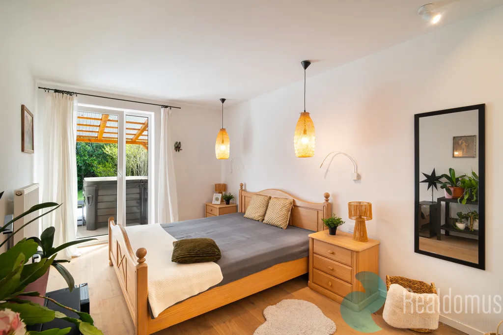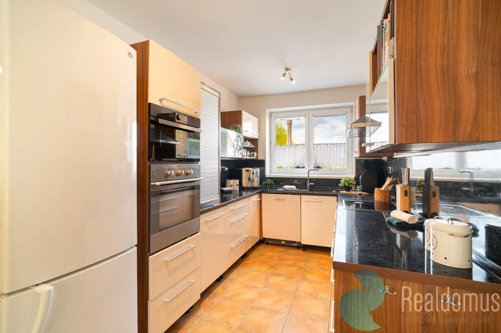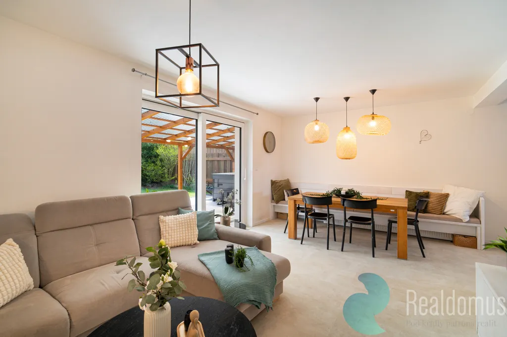 Srdcem domu je světlý obývací pokoj plynule propojený s kuchyní. Celý prostor působí velmi vzdušně a otevřeně a vytváří ideální místo pro rodinný život i setkávání s přáteli. Velké portálové dveře navazují na terasu se vstupem do zahrady, která nabízí příjemné soukromí a klid pro relaxaci. Součástí prodeje je také vířivka umístěná na terase, která ještě více podtrhuje komfort tohoto bydlení.