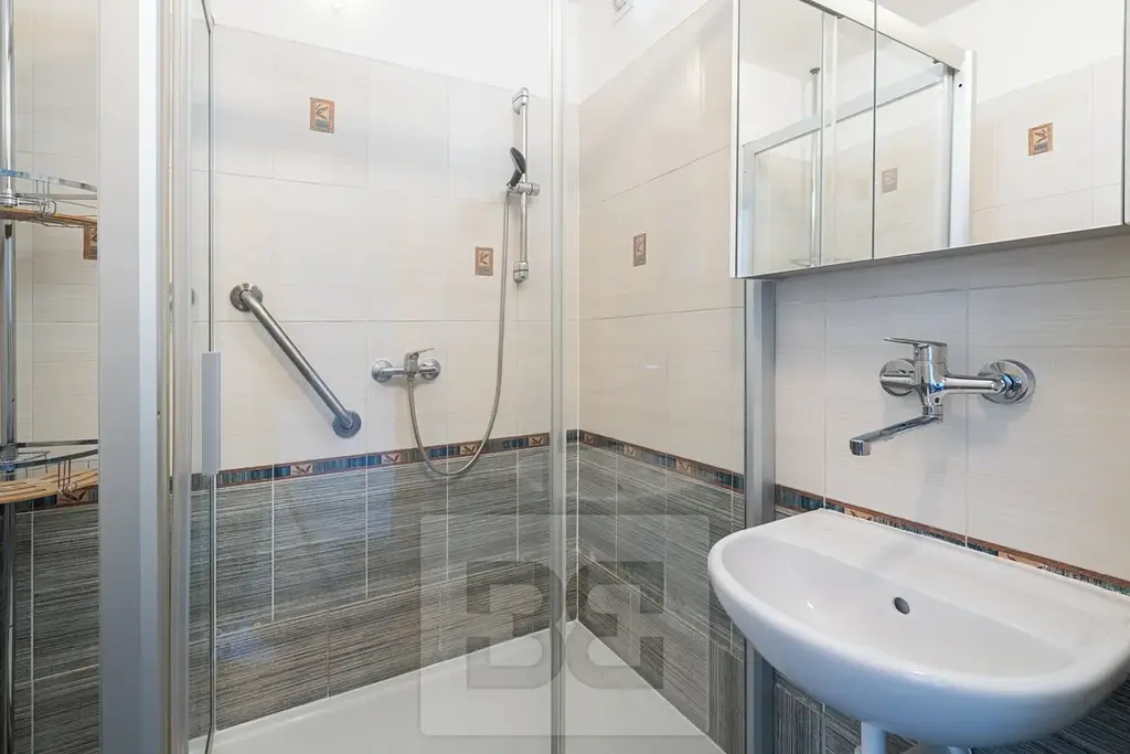 Dispozice dále zahrnuje dvě samostatné ložnice, koupelnu se sprchou a samostatně oddělenou toaletu. V předsíni je připravena přípojka pro pračku a sušičku. K bytu náleží komora situovaná přímo na patře.