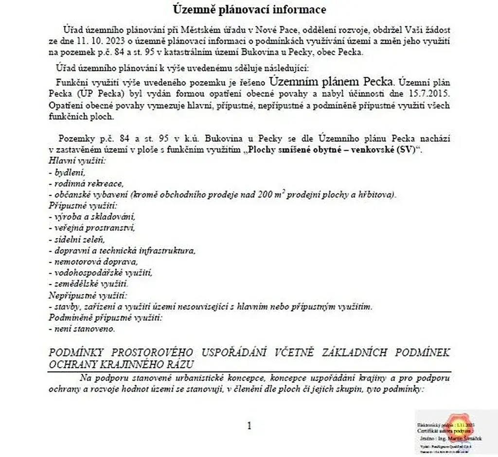 Přístup na pozemek je zajištěn po zpevněné cestě. Dle platného územního plánu je možné pozemek využít jak pro bydlení, tak pro rodinnou rekreaci, což ocení nejen rodiny s dětmi, ale i ti, kteří hledají klidné místo pro víkendové úniky z městského shonu. Intenzita využití zástavby je stanovena na 40 %, což poskytuje dostatek prostoru pro realizaci vašich představ o ideálním bydlení.