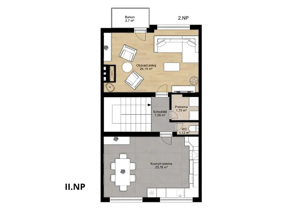 V prvním patře je situována prostorná kuchyně s jídelnou 23,78 m², obývací pokoj 24,15 m² se vstupem na balkon 2,7 m², prádelna 1,75 m², samostatné WC 1,12 m² a schodiště 7,59 m².