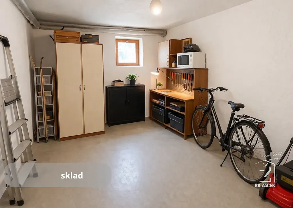 V přízemí se nachází vstupní hala 13,1 m², schodiště 7,59 m², chodba 4,72 m², garáž 17,3 m², kotelna 2,4 m², sklep 4,2 m², sklad 10,95 m² a vstup na zahradu o velikosti 75 m². Přízemí lze po úpravách využít také jako další obytné místnosti.