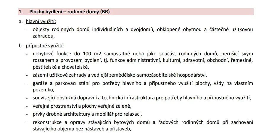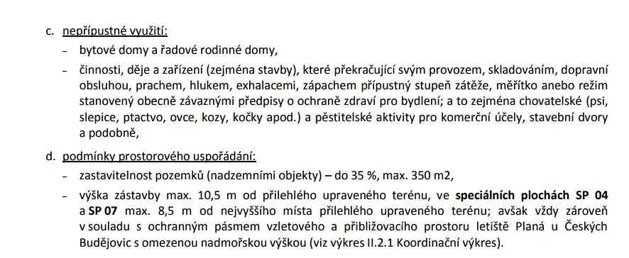 Parcela určená územním plánem pro výstavbu rodinného domu nebo dvojdomu nabízí zastavitelnost 35 % a umožňuje stavbu dvou nadzemních podlaží s podkrovím do maximální výšky 10,5 metru.