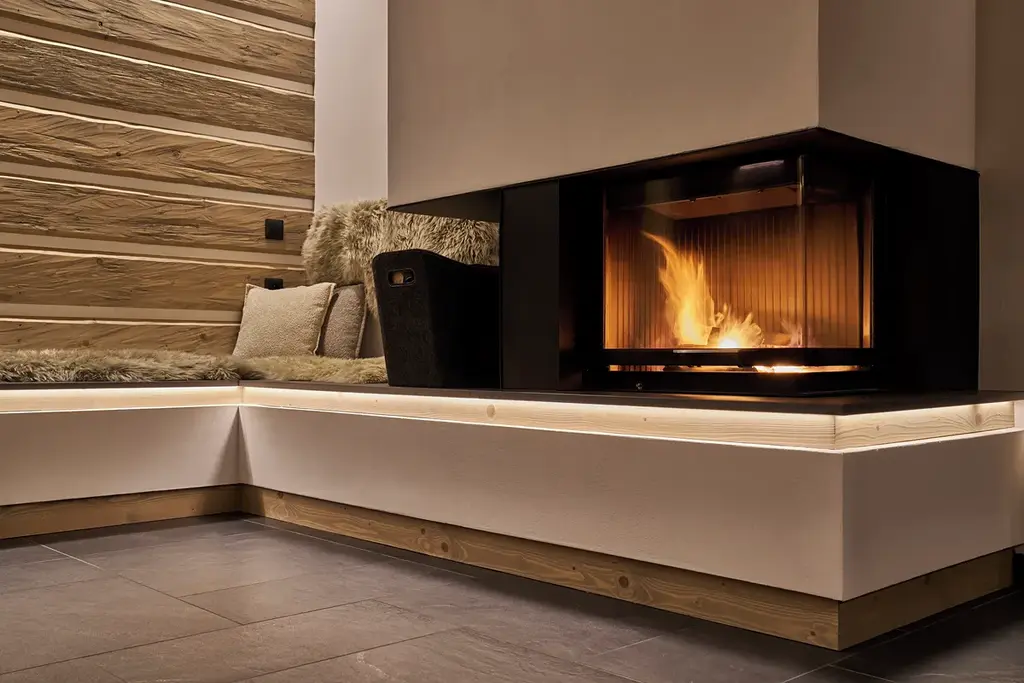 Prostorný obývací pokoj s krbem