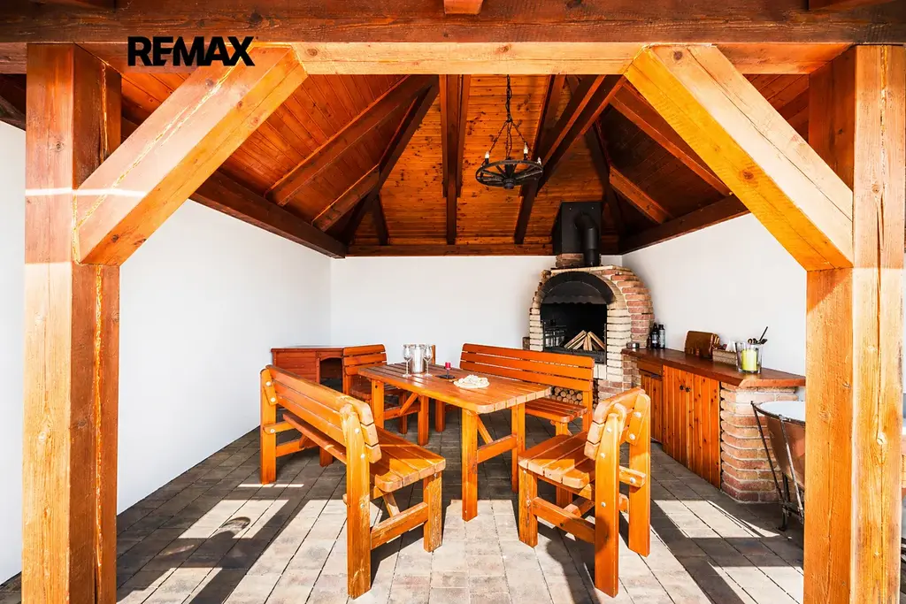 K bytu náleží venkovní zázemí o ploše 483 m², jehož součástí je zahrada, garáž a pergola. Zadní část pozemku nabízí příjemné soukromí – najdete zde dřevěnou pergolu s krbem a posezením, ideální pro letní večery s rodinou nebo přáteli. Přední část tvoří upravená zahrada se vstupem k bytu.