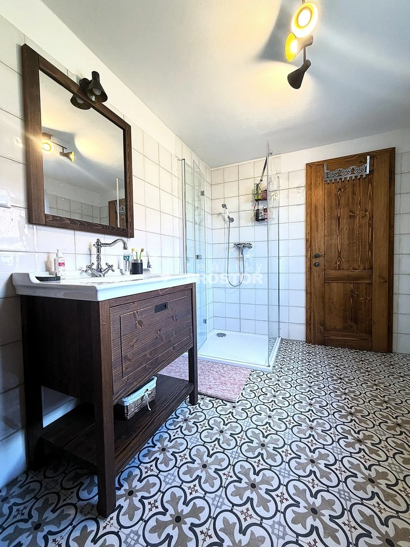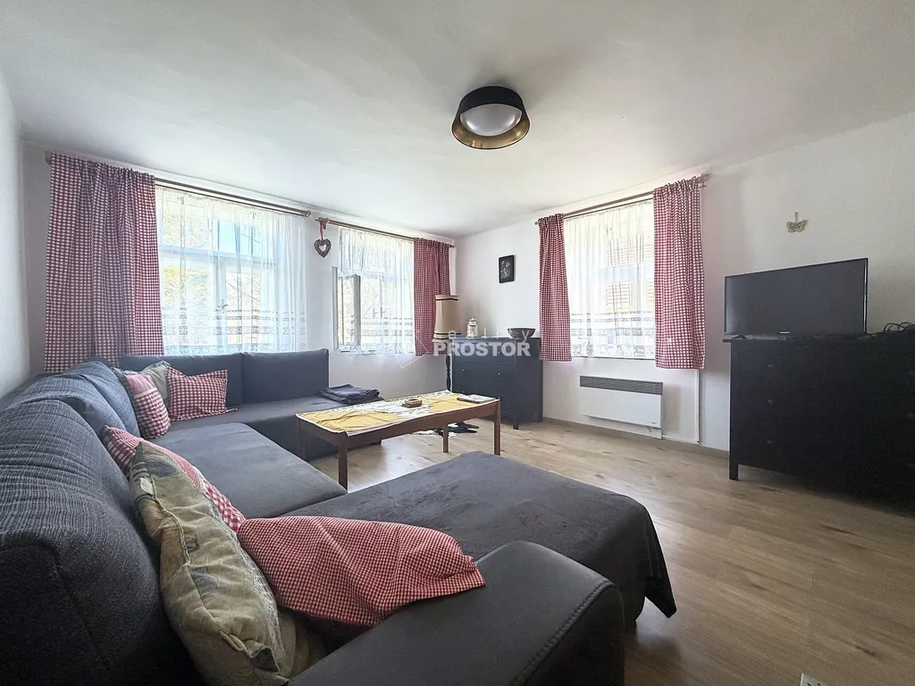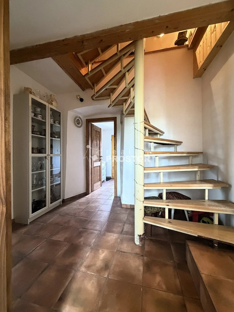 V přízemí domu je útulný obývací pokoj s krbovými kamny, kuchyně propojená s jídelnou a přímým vstupem na zahradu, kde se nachází dřevěná pergola ideální pro letní posezení. Součástí je také stodola s dílnou, která nabízí další potenciál využití.