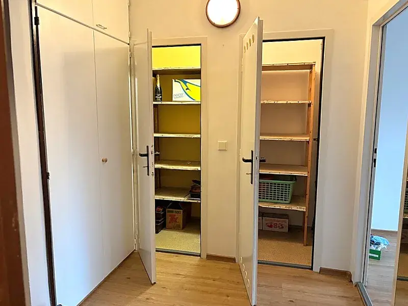 Byt má předsíň se 2 komorami, vestavnou skříň, první pokoj o rozloze 10 m2, druhý pokoj o rozloze 17,5 m2 + kuchyňský kout. K bytu patří zasklená lodžie cca 6 m2 a sklep 3 m2. Z lodžie je s výhled do parku.