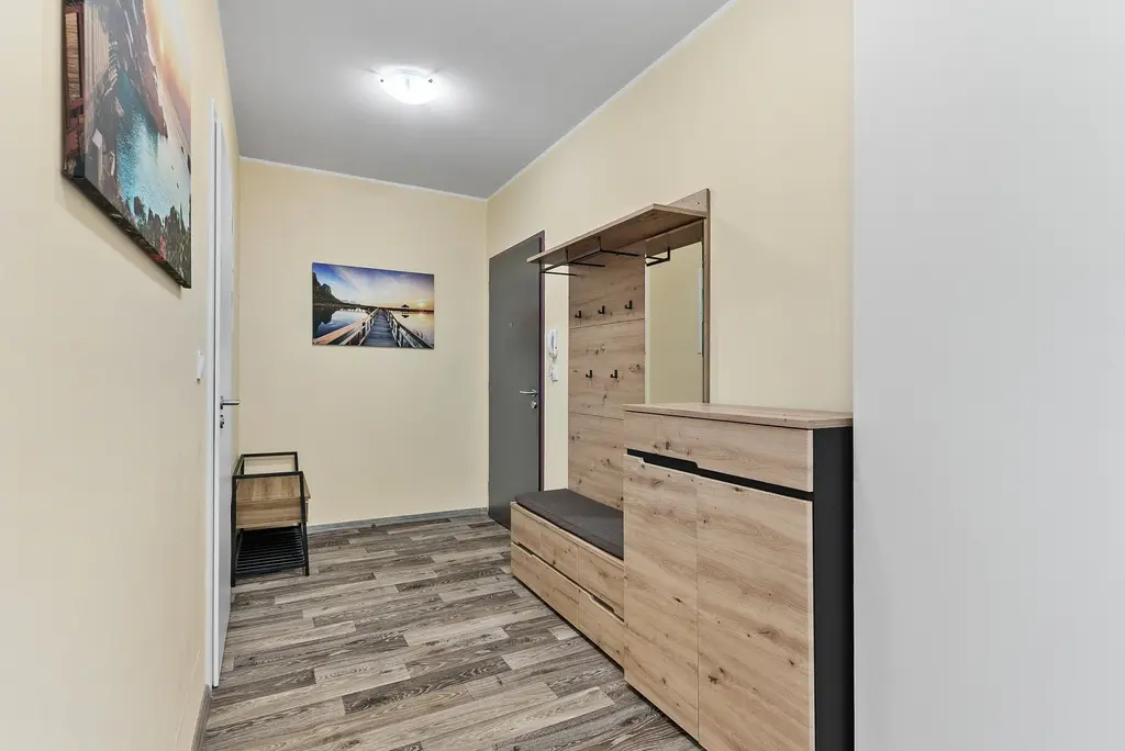 Byt se pronajímá plně zařízený včetně veškerých elektrospotřebičů. Kuchyňská linka je vyrobena na míru a vybavena troubou, varnou deskou, myčkou a digestoří. V ložnici se nachází vestavěné skříně a manželská postel. Koupelna je vybavena pračkou, sušičkou a umyvadlovou skříňkou. Obývací část nabízí rohovou pohovku, pohodlné křeslo, jídelní (barové) židle, knihovnu, komodu, konferenční stolek a televizor. V předsíni jsou k dispozici komody, botník a věšák.