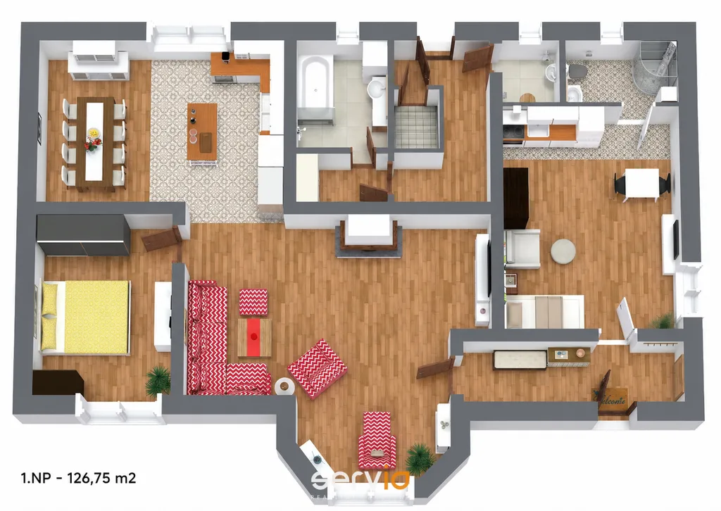 1.NP - 126,75 m2 - kuchyň, obývací pokoj, ložnice, koupelna, samostatné WC, komora, chodba, zádveří + garsonka 1+kk se samostatným vstupem a vlastní koupelnou.