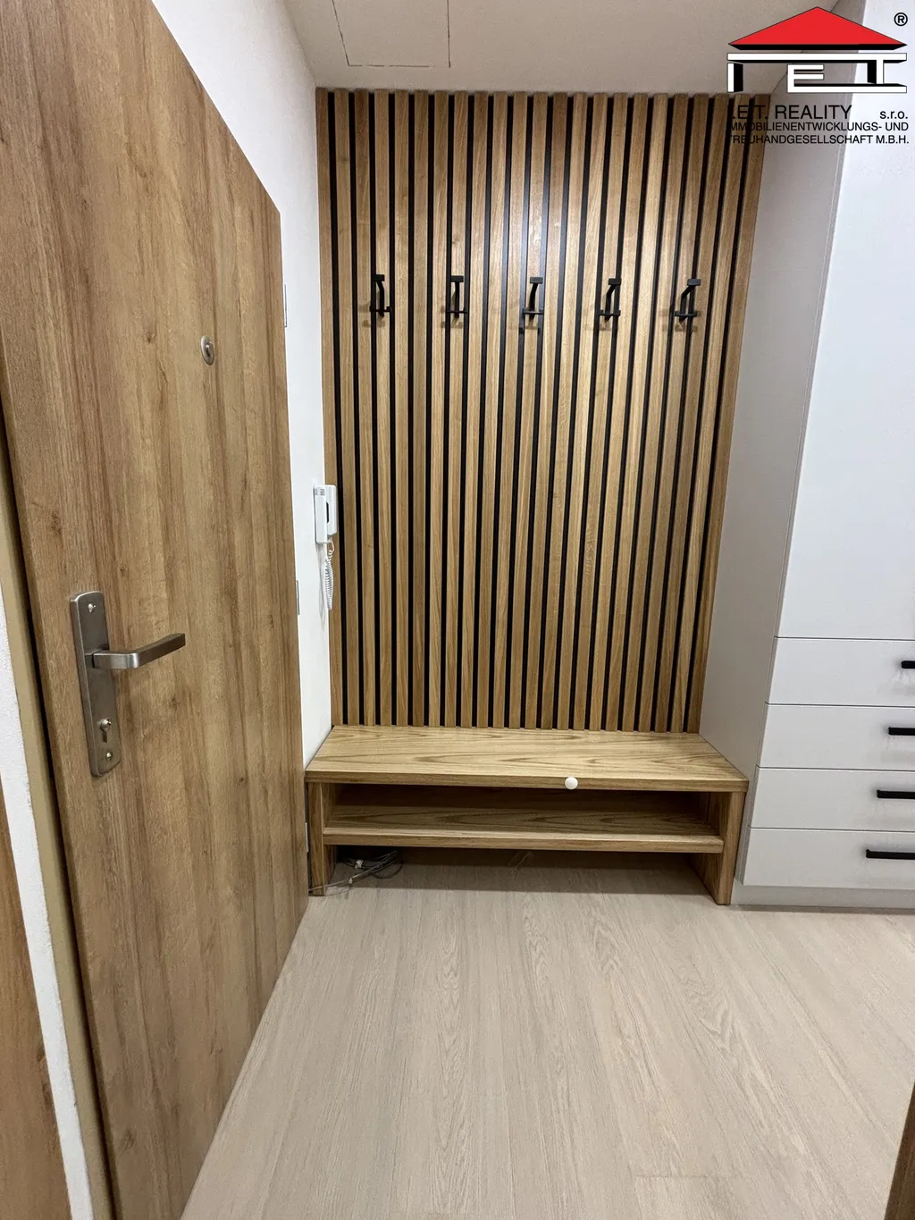 Koupelna je provedena v nadčasovém designu a disponuje sprchovým koutem, koupelnovým nábytkem a prostorem pro pračku i sušičku. Toaleta je samostatná a vybavena vlastním umyvadlem. Vstupní chodba je velmi prakticky řešena – nabízí vestavěné skříně, botník i věšákovou stěnu, což zajišťuje dostatek úložného prostoru.
