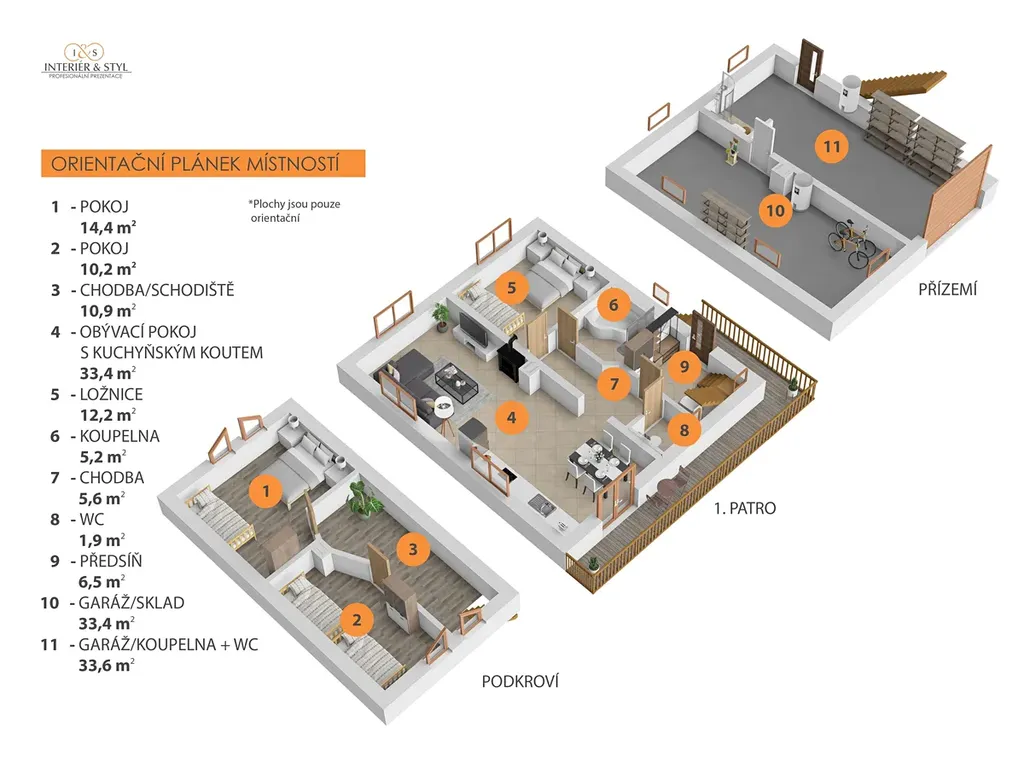 • Přízemí: Garáž, sprchový kout, WC, technická místnost