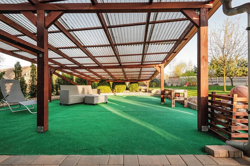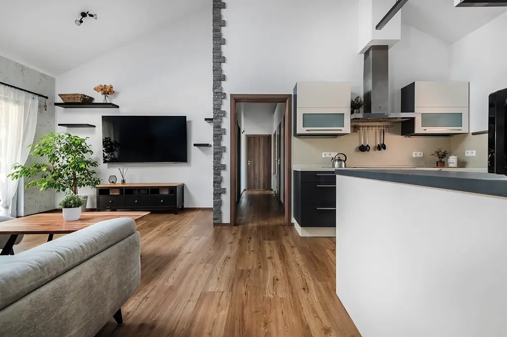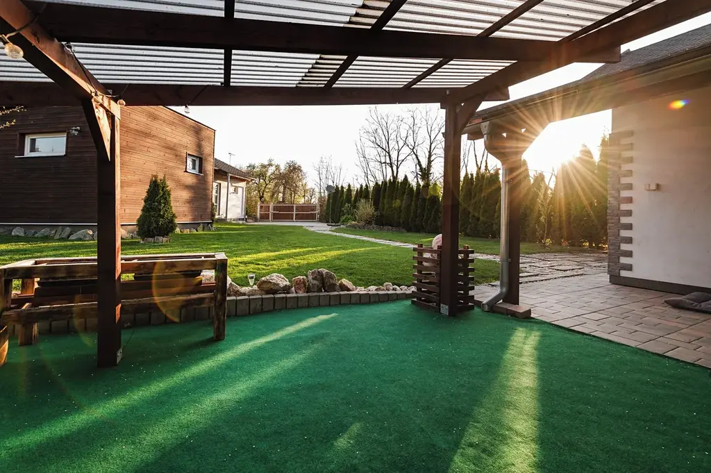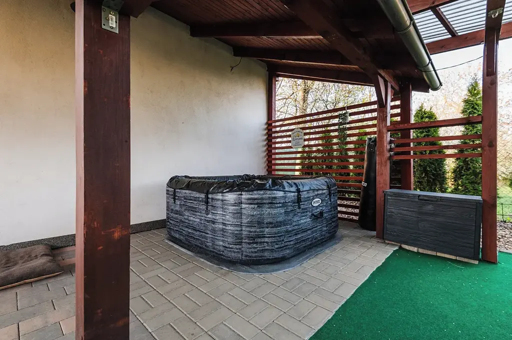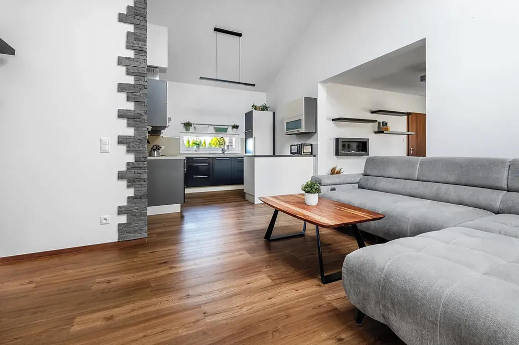 Centrem domu je světlý obývací pokoj s plně vybavenou kuchyňskou linkou, který působí moderně, vzdušně a velmi příjemně. Z obývacího pokoje je přímý vstup na krytou terasu s pergolou, která přirozeně rozšiřuje obytný prostor směrem do zahrady. V jídelní části navíc najdete biokrb, který dotváří útulnou atmosféru.