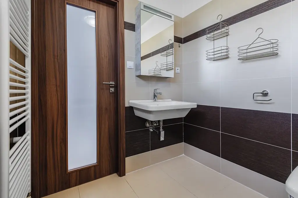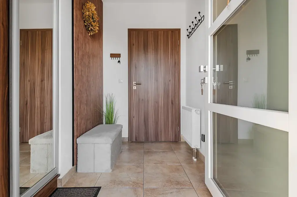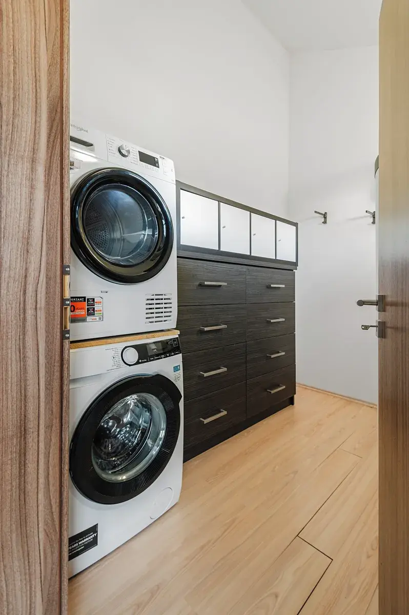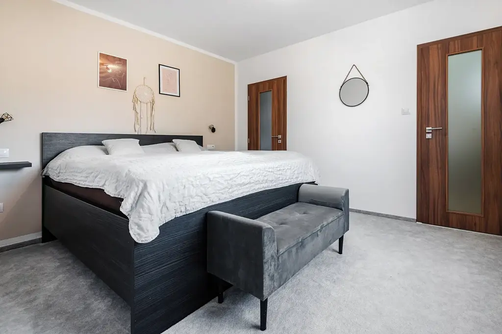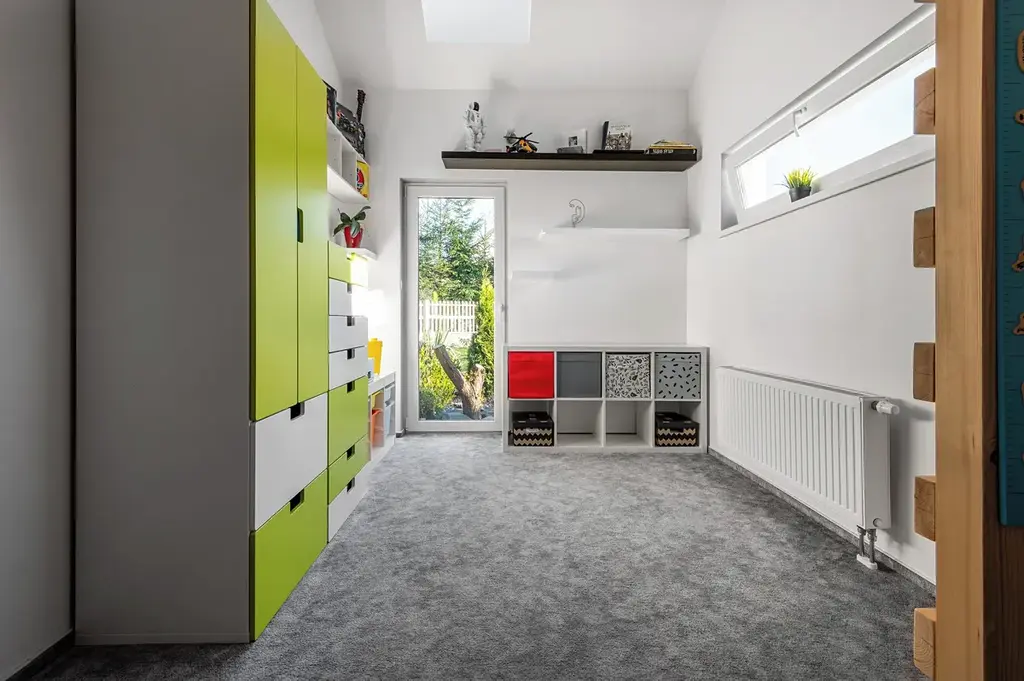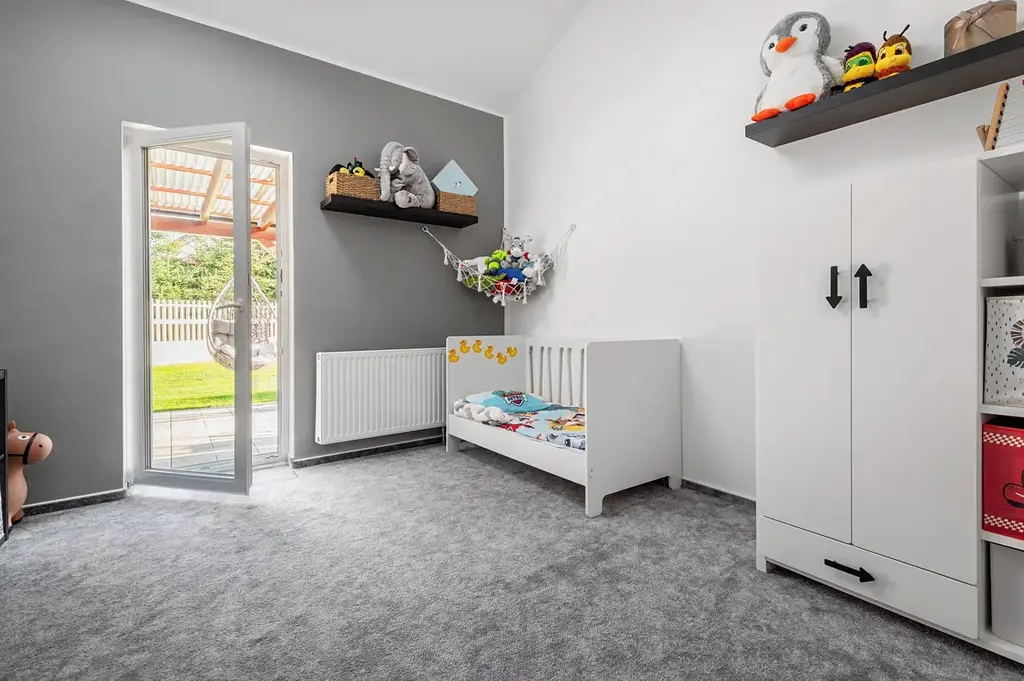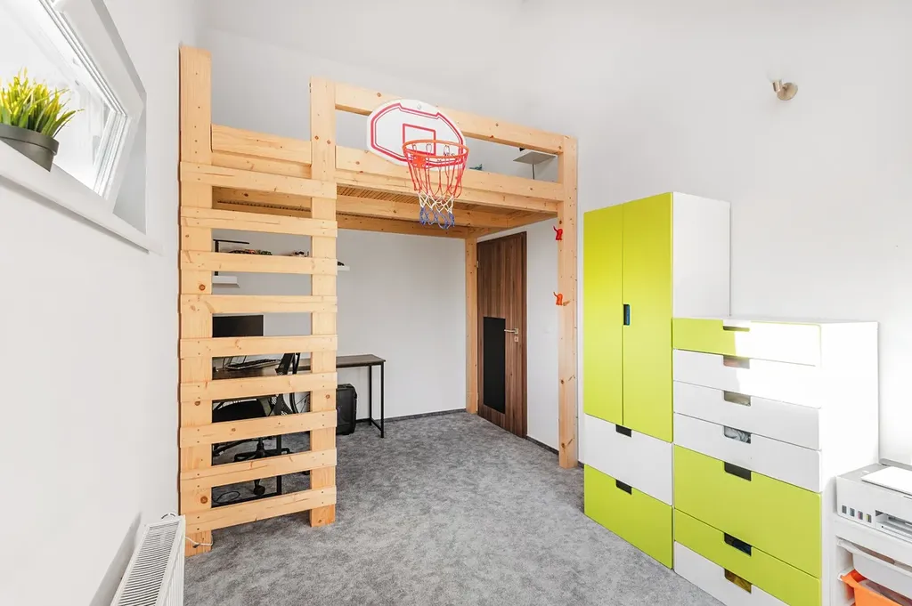 Dům nabízí tři samostatné ložnice, dvě koupelny a dvě toalety, dále praktickou technickou místnost, samostatnou šatnu a dostatek úložného prostoru včetně vestavné skříně ve vstupní části domu. Jeden z dětských pokojů je navíc řešen dřevěným patrem na spaní, které efektivně využívá prostor a vytváří více místa pro hraní či pracovní kout.