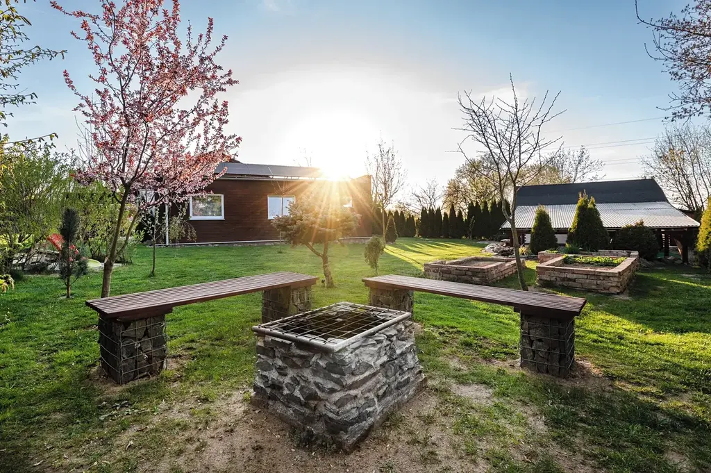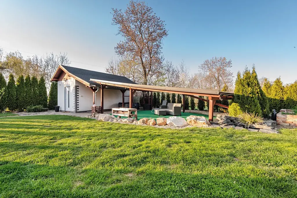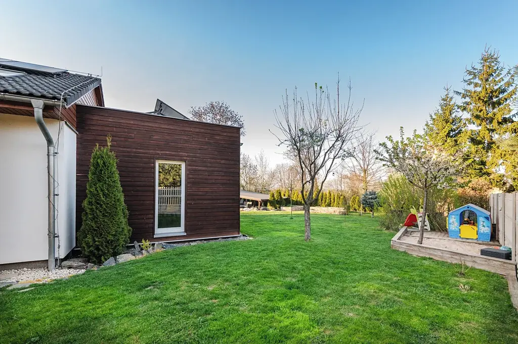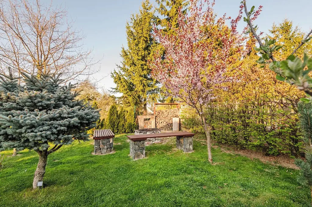 Pozemek o velikosti 871 m² je krásně upravený a poskytuje vysokou míru soukromí díky vzrostlé zeleni. Najdete zde zapuštěný bazén s pergolou, zahradní domek, stylové ohniště i dostatek prostoru pro relaxaci i aktivní využití.