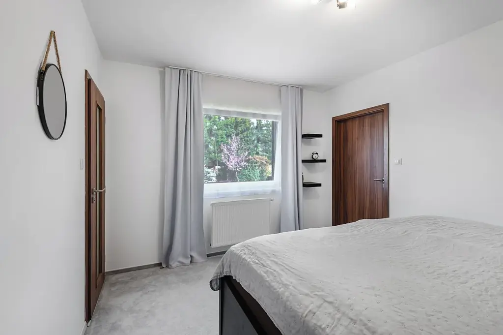 Dispozice 5+kk o podlahové ploše 110 m² byla rozšířena o přístavbu, která přináší zcela nový rozměr využití prostoru. V této části domu se nachází jídelna, ložnice, koupelna a samostatná šatna, což vytváří oddělenou klidovou zónu ideální například pro rodiče nebo návštěvy a výrazně zvyšuje komfort i soukromí.