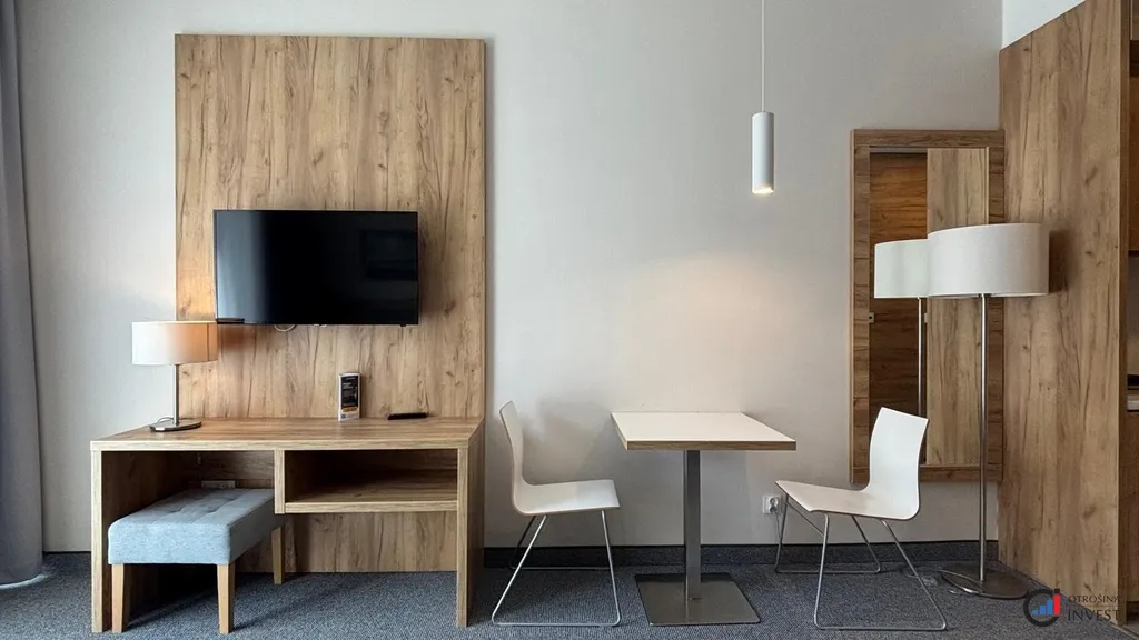 Apartmán sestává z obývacího pokoje s kuchyňským koutem, předsíně, koupelny a balkonu. Nábytek a vybavení jsou součástí ceny.