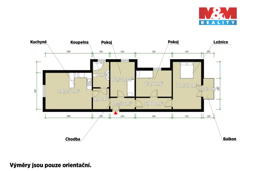 Exkluzivně nabízíme k prodeji prostorný byt o dispozici 4+kk situovaný ve 2. nadzemním podlaží udržovaného domu v atraktivní části Mariánských Lázní. Byt disponuje podlahovou plochou 90,3 m² a nabízí promyšlené rozvržení místností – centrální obytný prostor s kuchyňským koutem, ložnici a dva samostatné pokoje, které lze využít jako dětské pokoje, pracovnu či pokoj pro hosty. Součástí je koupelna s WC, praktická vstupní předsíň a balkon orientovaný do klidného prostředí, ideální pro odpočinek.