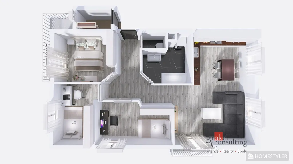 Byt zaujme nejen svou promyšlenou dispozicí, ale i dostatkem světla díky orientaci oken na jih, západ a sever. Součástí jsou dva balkony o velikosti 6 m² a 3 m², které poskytují příjemný prostor pro relaxaci během celého dne.