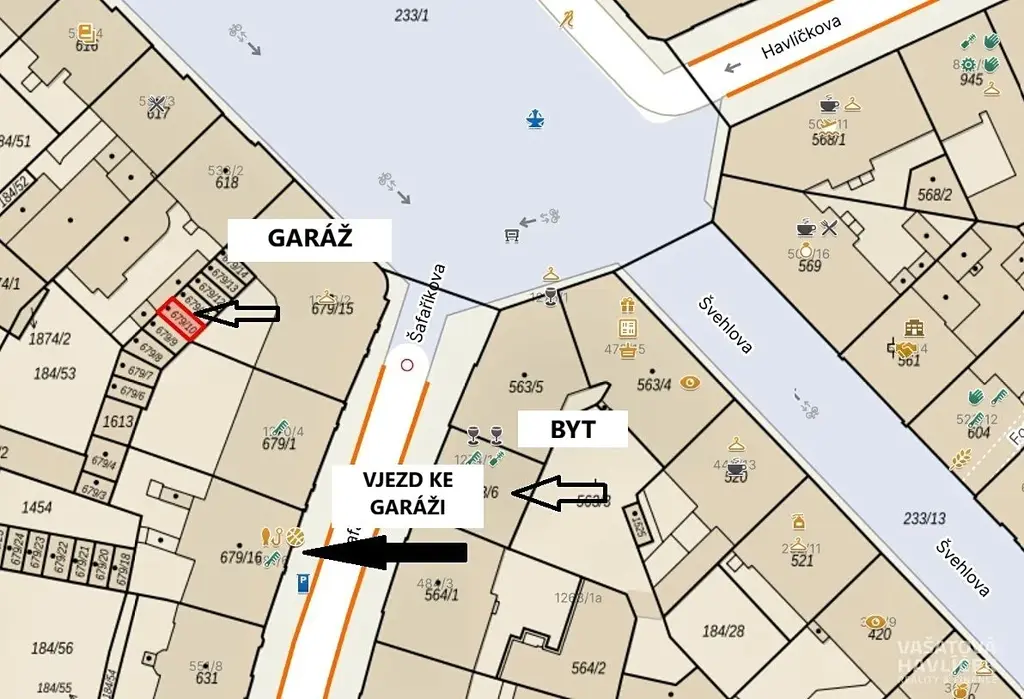 K bytu je možné dokoupit garáž, která se nachází ve vnitrobloku přímo naproti domu (viz obrázek). Koupě garáže není podmínkou prodeje bytu.