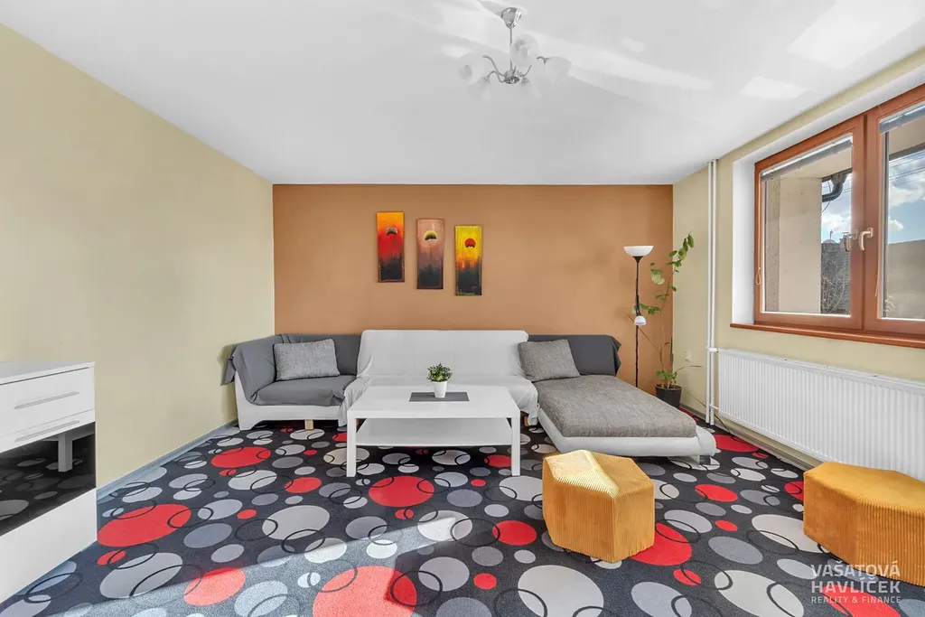 Byt 5+1 (cca 90 m²) v podkroví: chodba, komora, kuchyň, koupelna s WC, obývací pokoj s balkónem, tři pokoje.