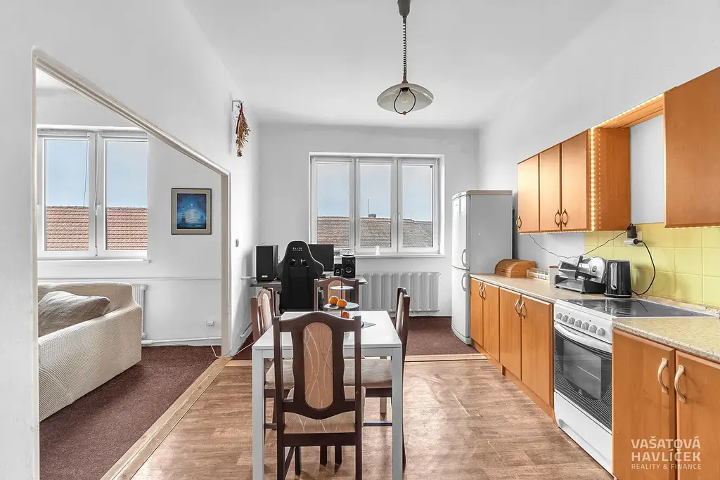 Byt 3+1 prošel částečnou renovací (rozvody elektřiny jsou provedeny v mědi, plastová okna). Je orientovaný na J a V stranu (do Jungmannovy ulice a do Havlíčkovy ulice). Byt je vytápěn plynovým kotlem, voda je ohřívána el. bojlerem. Na podlaze v bytě jsou parkety, na nich jsou položeny koberce, v kuchyni linoleum, v chodbě leštěná žula.